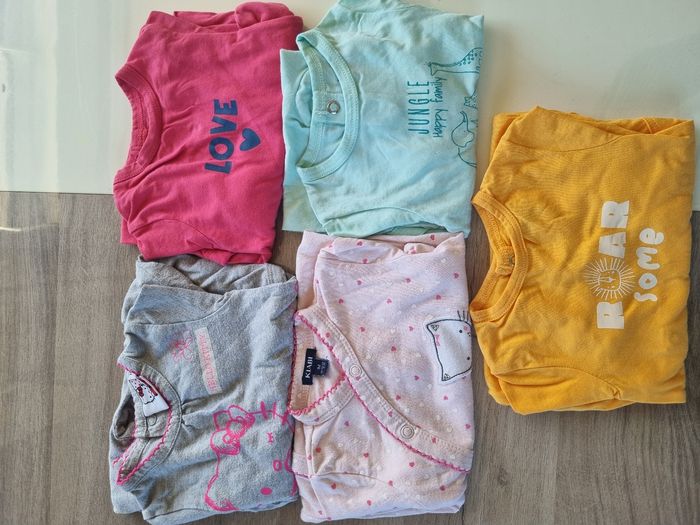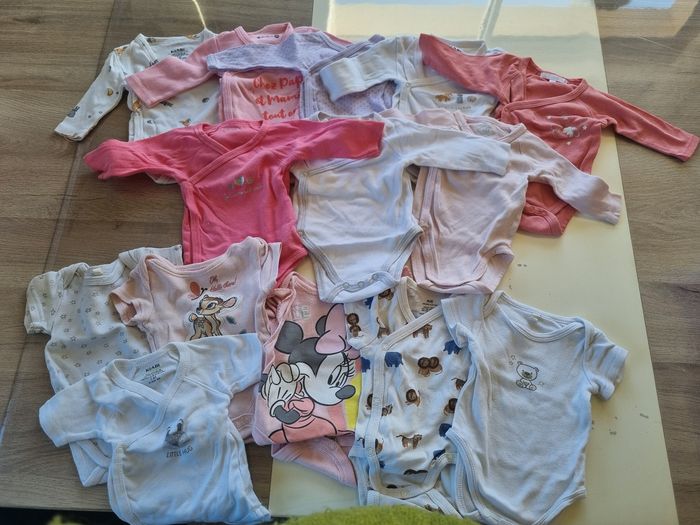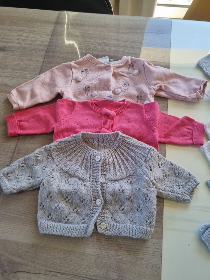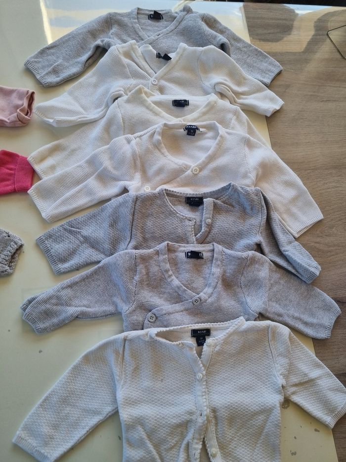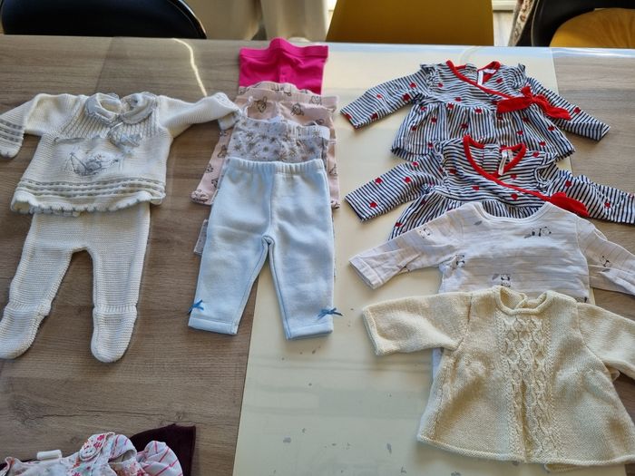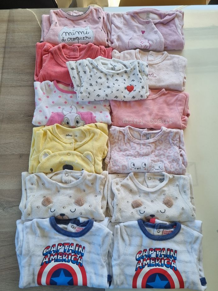 13 pyjamas velours, 5 pyjamas cotons, 6 bodys MC, 11 bodys ML, 10 gilets, 9 bonnets, 3 robes, 4 hauts, 1 pantalon, 3 leggings, 1 ensemble laine.