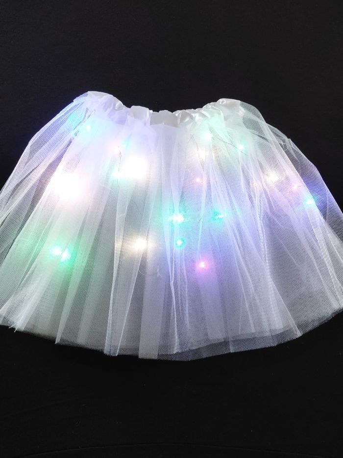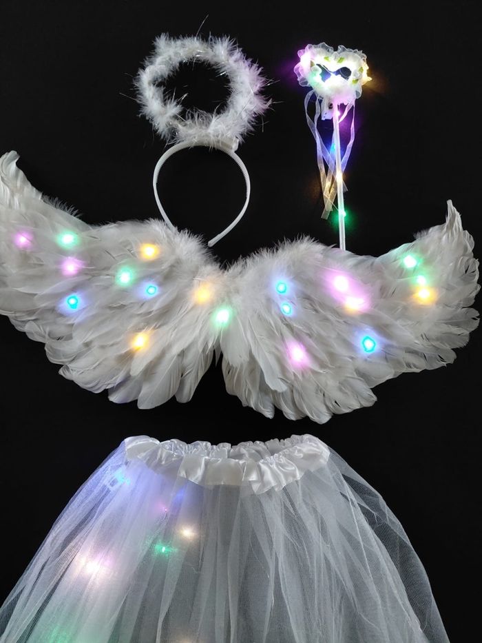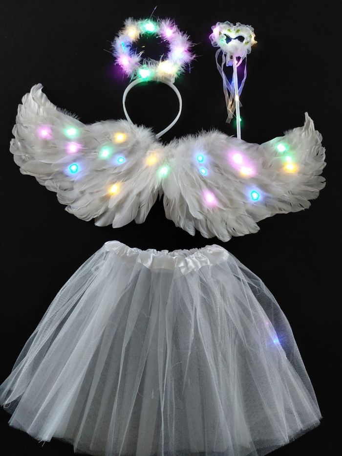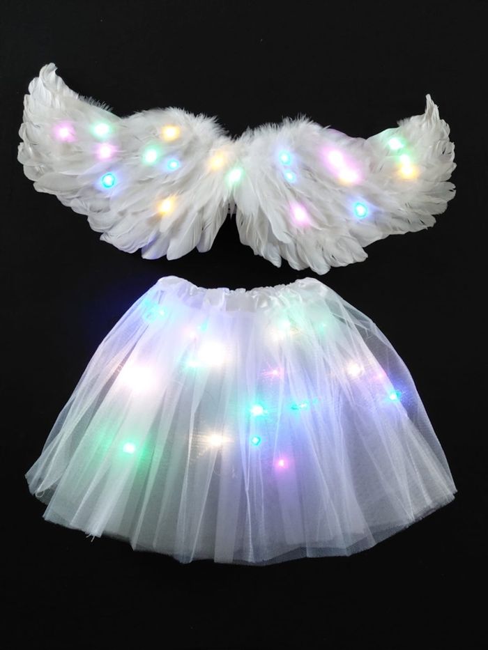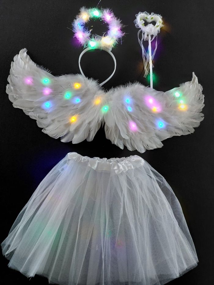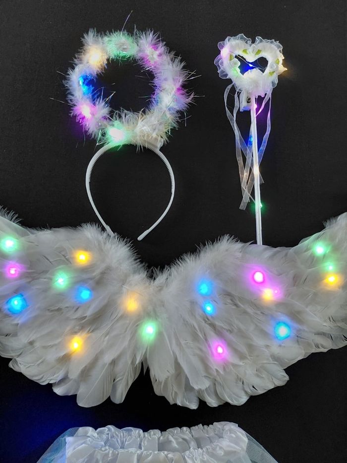 Déguisement ailes ange à LED composé de 4 pièces, une jupe, les ailes de papillon (élastique à enfiler), une baguette et un serre tête. Jupe tutu élastique. Vendu neuf dans son emballage d’origine. Convient aux petites filles de 3-6ans. Expédition rapide après votre commande