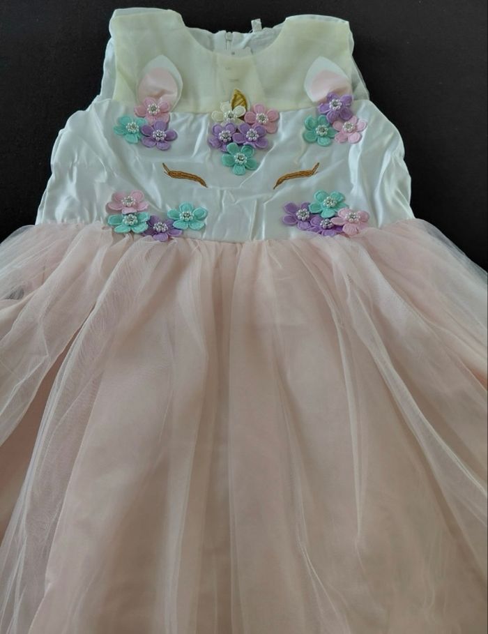 Déguisement robe licorne rose et ces accessoires (gant, bijoux, couronne, baguette). La robe mesure 80cm de longueur, la taille convient aux petites filles de 7-8ans. Totalement neuve, vendue dans son emballage d’origine. Expédition rapide après votre commande
