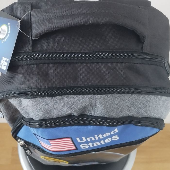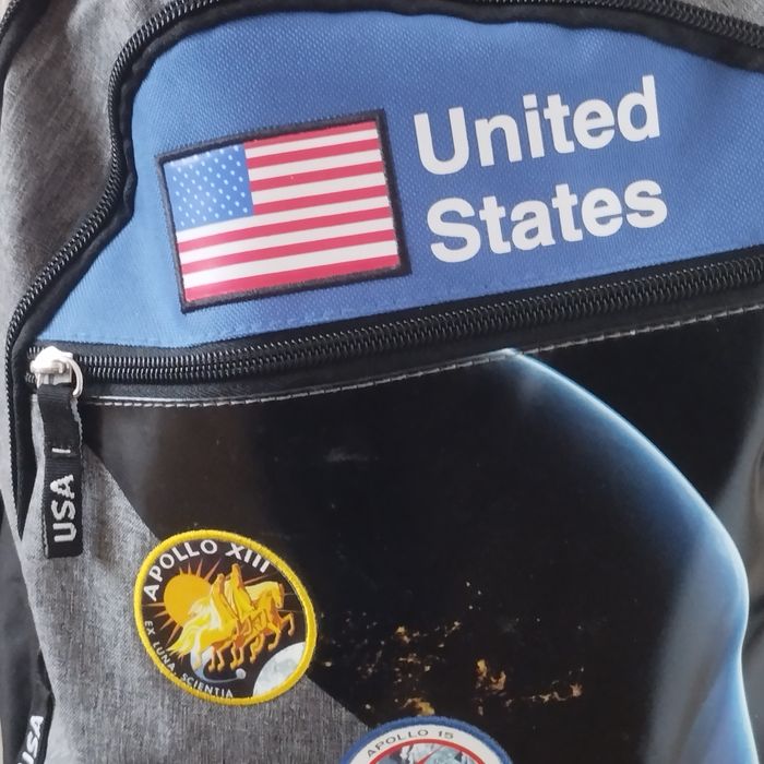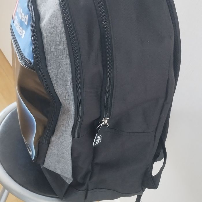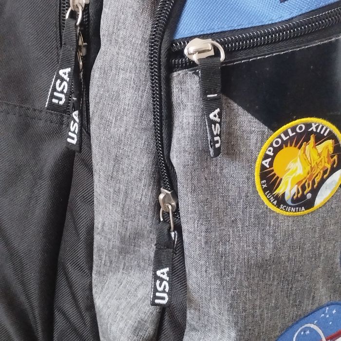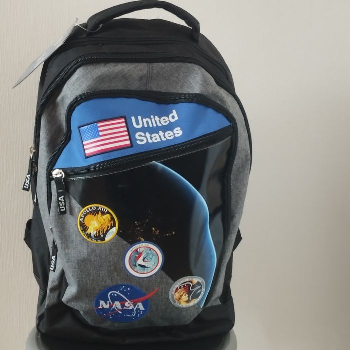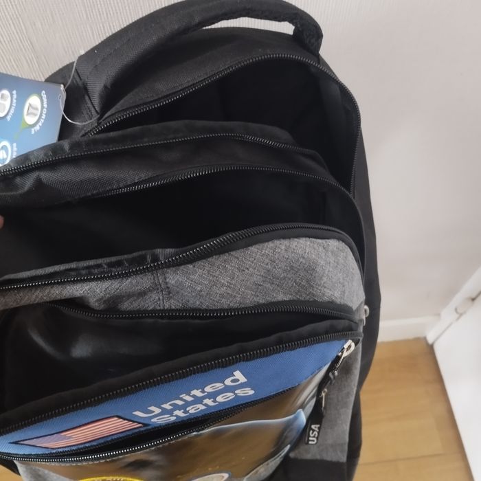 Sac à dos Neuf, Nasa de la Plume Dorée. 2 grandes poches + 2 moyennes zippées. Poignée dos et bretelles rembourrés. Confortable et résistant. Hauteur 45cm Largeur 32cm Profondeur 16cm Poids 470grs. Noir et gris. Motifs cousus.