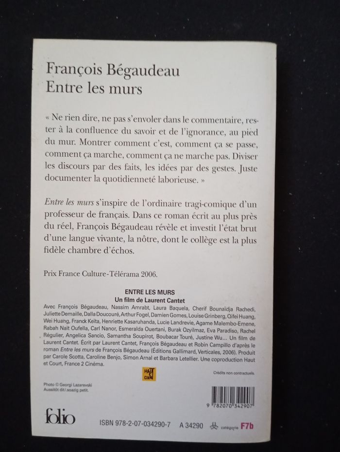 Je vends ce roman "Entre les murs" de l'auteur François Bégaudeau, édition brochée. - Titre : Entre les murs - Auteur : François Bégaudeau - Éditeur : Folio - Année d'édition : 2006 - Format : Broché Bon état N'hésitez pas à me contacter pour plus d'informations !