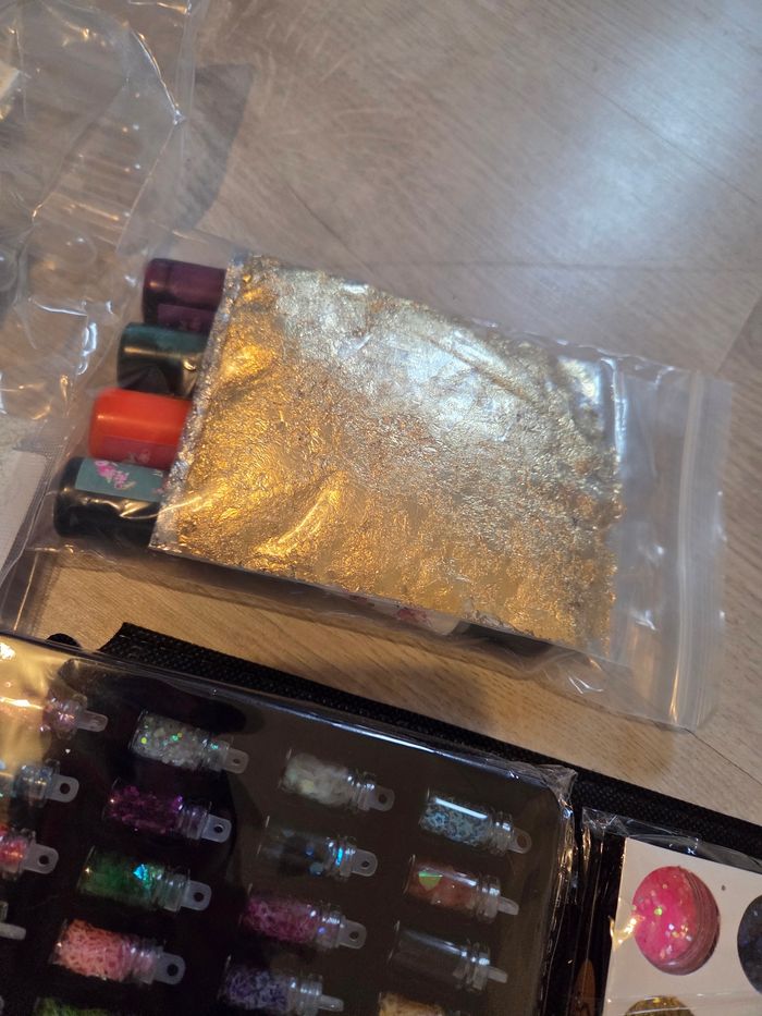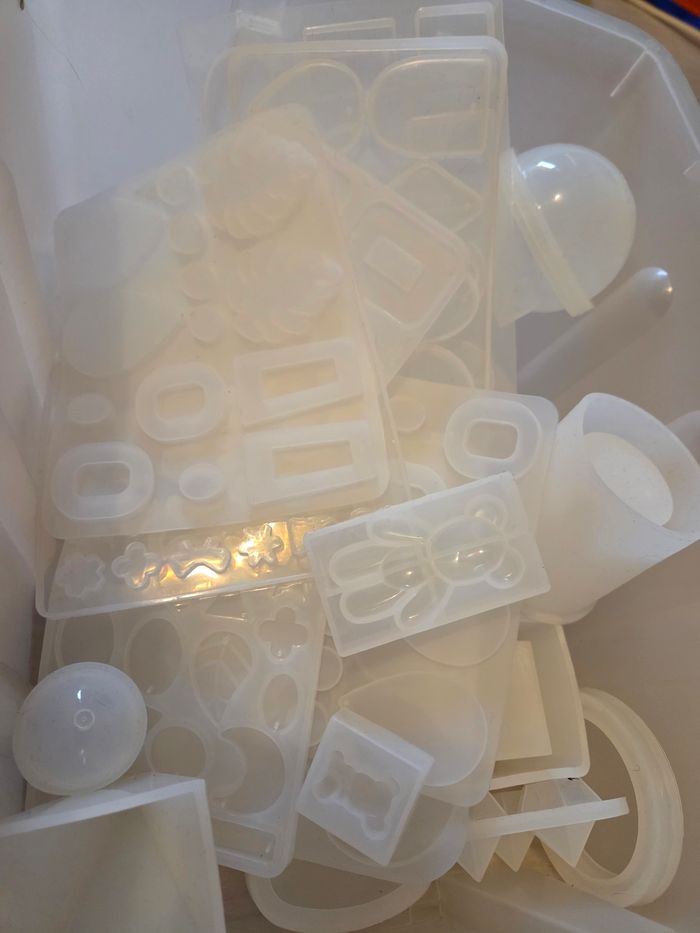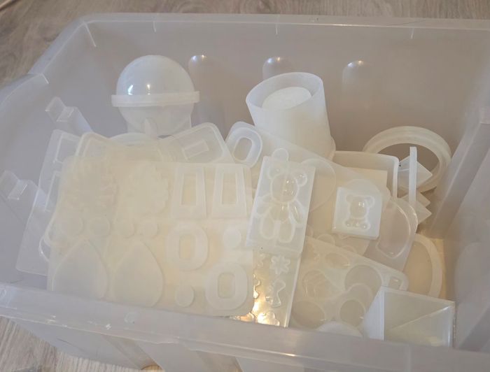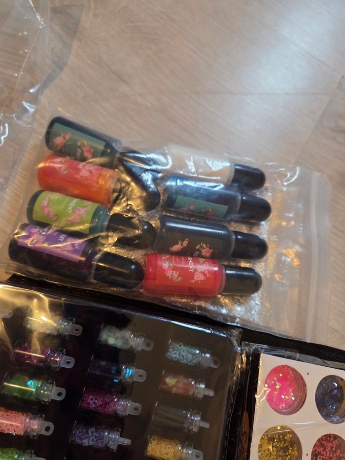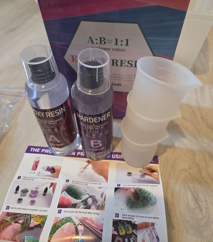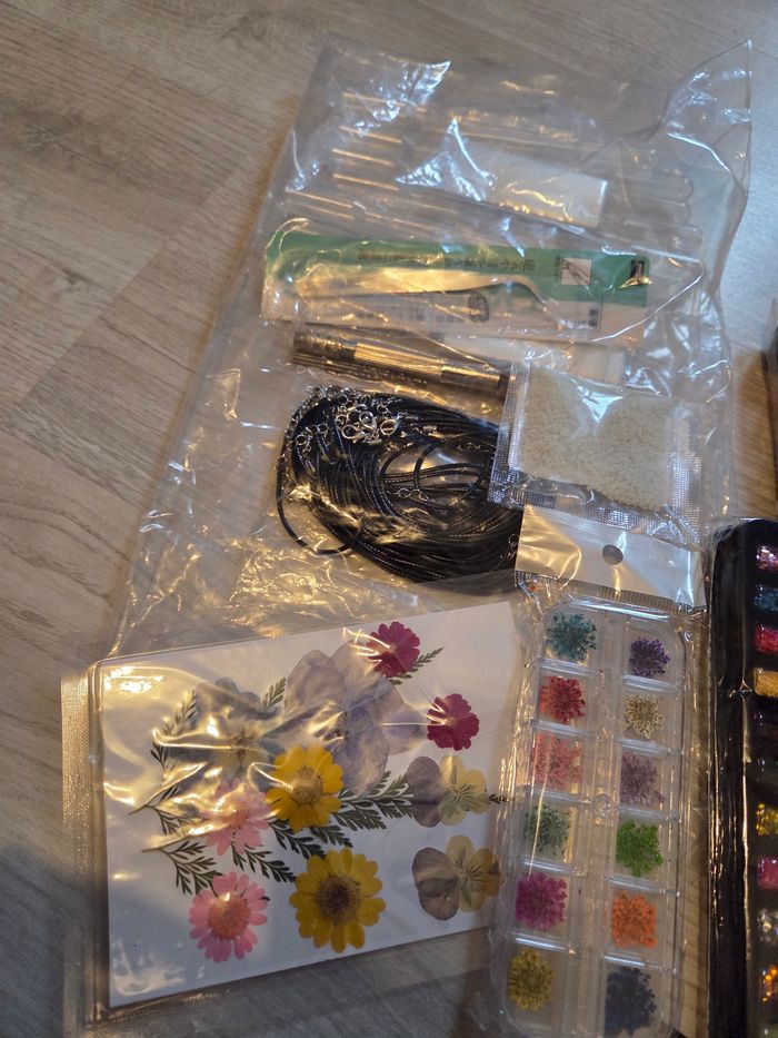Kit Résine epoxy NEUF Parfait pour ceux qui veulent débuter dans la création en Résine epoxy Comprend : - Mélange résine (photo 2) - Divers moules (photos 3 et 4) - 8 pigments (photo 8) - Paillettes/Strass (photos 5 et 6) - Feuilles d’or et d'argent (photo 7) - Fleurs séchées, poudre phosphorescente et divers accessoires, ex pour colliers ou boucle d’oreille (photo 9)