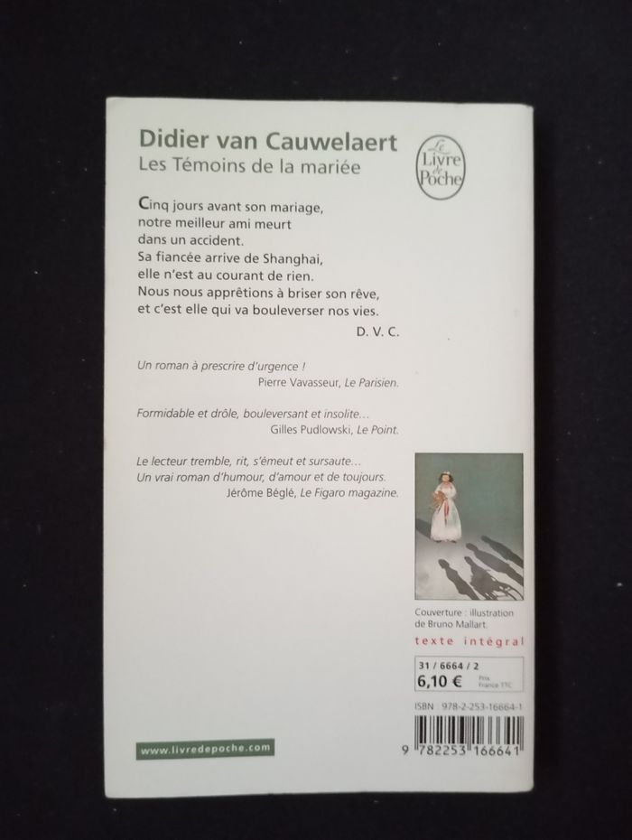 Je vends ce roman "Les Témoins de la mariée" de Didier Van Cauwelaert, édition poche. - Titre : Les Témoins de la mariée - Auteur : Didier Van Cauwelaert - Éditeur : Le Livre de Poche - Format : Poche - Langue : Français Bon état N'hésitez pas à me contacter pour plus d'informations !