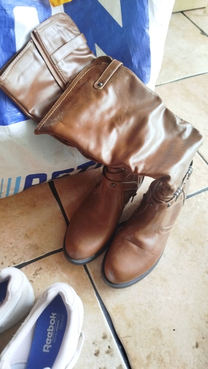 Deux paires de bottes une marron l' autre noir en bon état Une paire de converse rose pâle Une paire de tennis marron