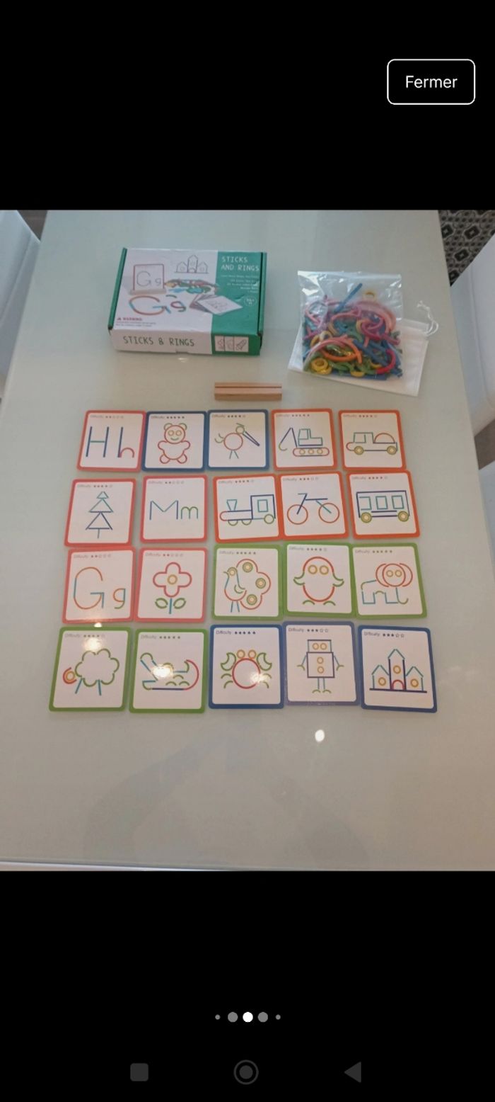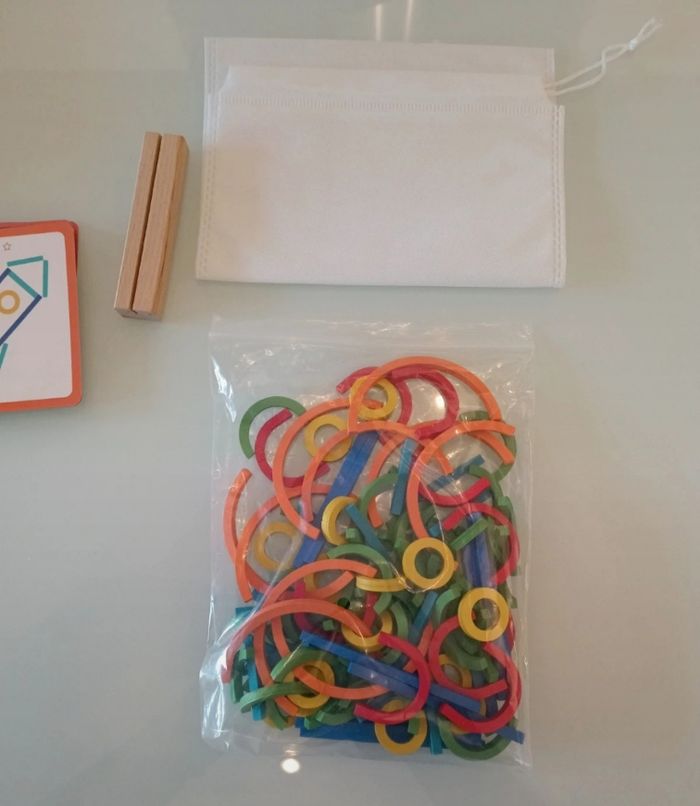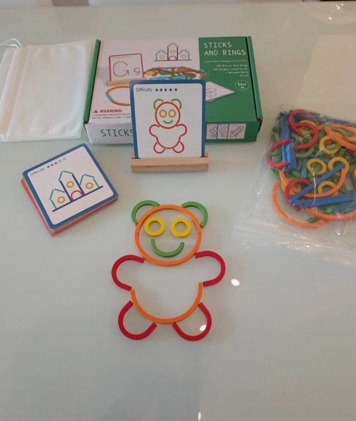 Jeu éducatif, méthode Montessori favorisant la créativité et le développement intellectuel de l’enfant. Idéal pour la maison, les écoles maternelles, les assistantes maternelles ou les structures d’accueil. 🎯 Objectif pédagogique : Composé de bâtonnets et cercles colorés, il permet de : - Travailler la motricité fine et la coordination œil-main - Reconnaître les couleurs et les formes - Stimuler la concentration et l’imagination - Encourager l’autonomie et l’apprentissage ludique 📦 Contenu : - 120 formes en bois colorée - 20 cartes défi recto-verso - 1 sac de rangement - 1 support de carte ✅ État : Neuf 📮 Envoi rapide et soigné dans les 24H