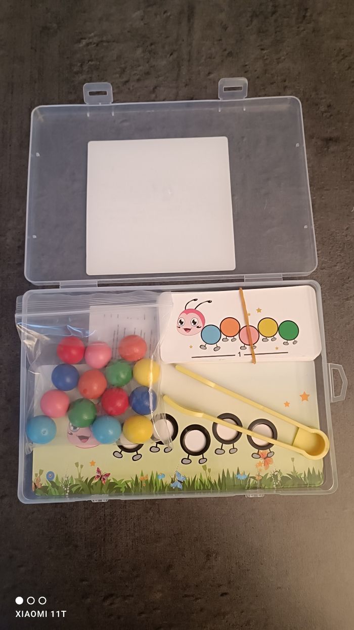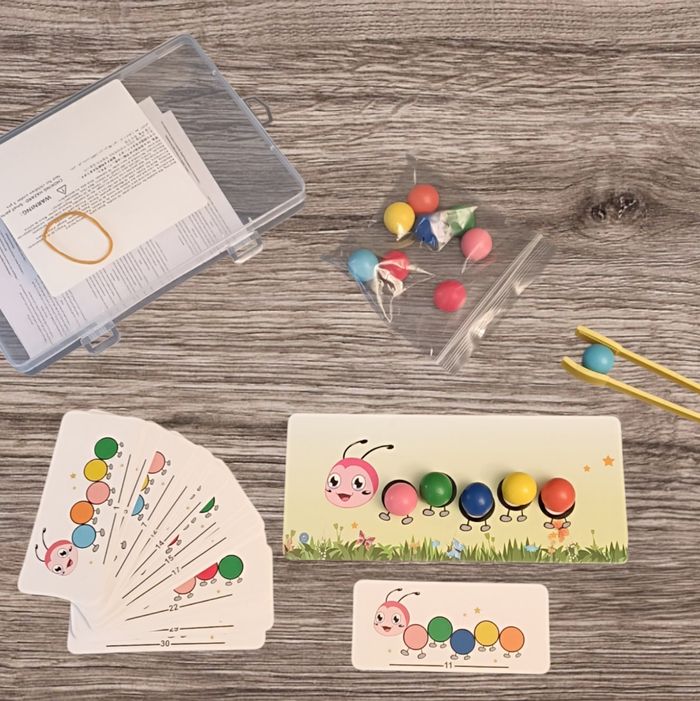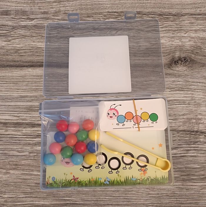 Un jouet ludique et éducatif parfait pour développer la motricité fine, la coordination œil-main et la reconnaissance des couleurs chez les jeunes enfants. L’enfant utilise la pince pour placer les perles colorées sur le modèle de la chenille, en suivant les cartes modèles. 🎯 Objectifs pédagogiques : • Développer la motricité fine et la précision des gestes • Renforcer la concentration et la coordination • Apprendre les couleurs et l’ordre logique • Encourager la patience et la persévérance • Favoriser l’autonomie et la confiance en soi 📦 Contenu du coffret : • 1 plateau illustré d’une chenille 🐛 • 30 cartes modèles colorées • 1 pince ergonomique adaptée aux petites mains • 14 perles colorées en bois • Boite de rangement Neuf