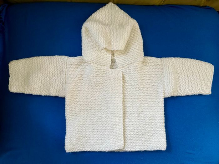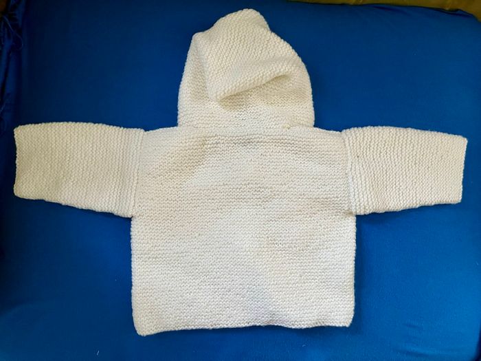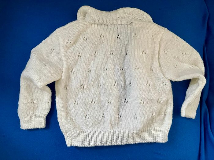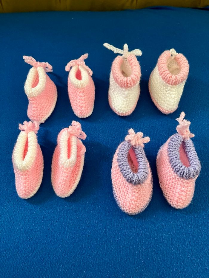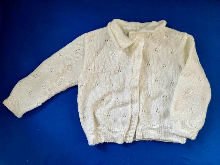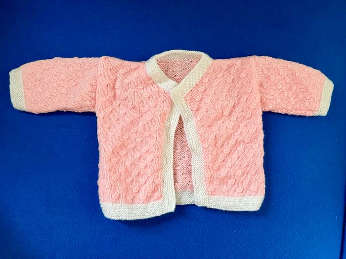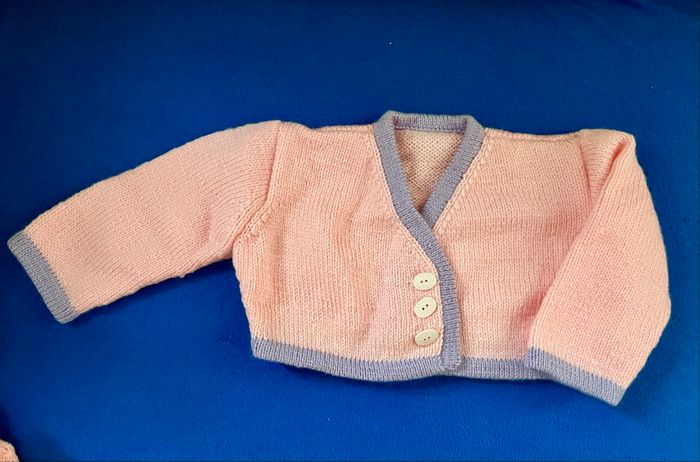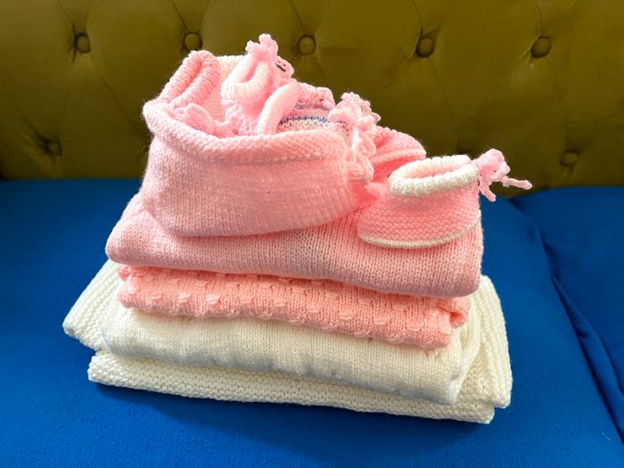 Très beau coffret bébé tricoté main, produits rares, tout est neuf, comprenant 4 gilets, 1 bonnet et 4 paires de chaussons.