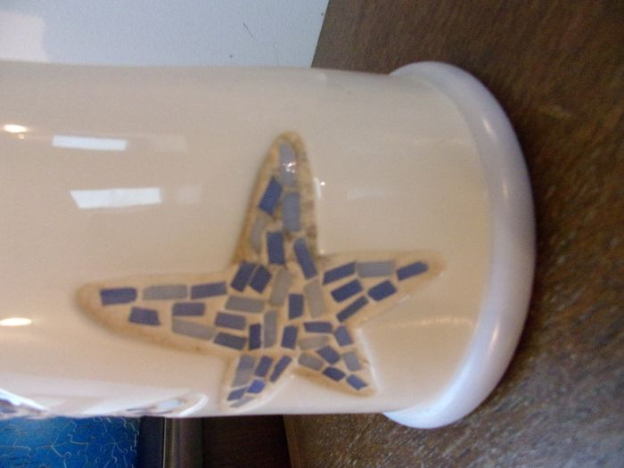 Porte brosse WC marin la brosse peut -être changé, la peinture sur le manche s'écaille Parfait état pour le porte brosse Juste une tâche au niveau de l'étoile En matière cassable Lavé avant vente Envoie possible