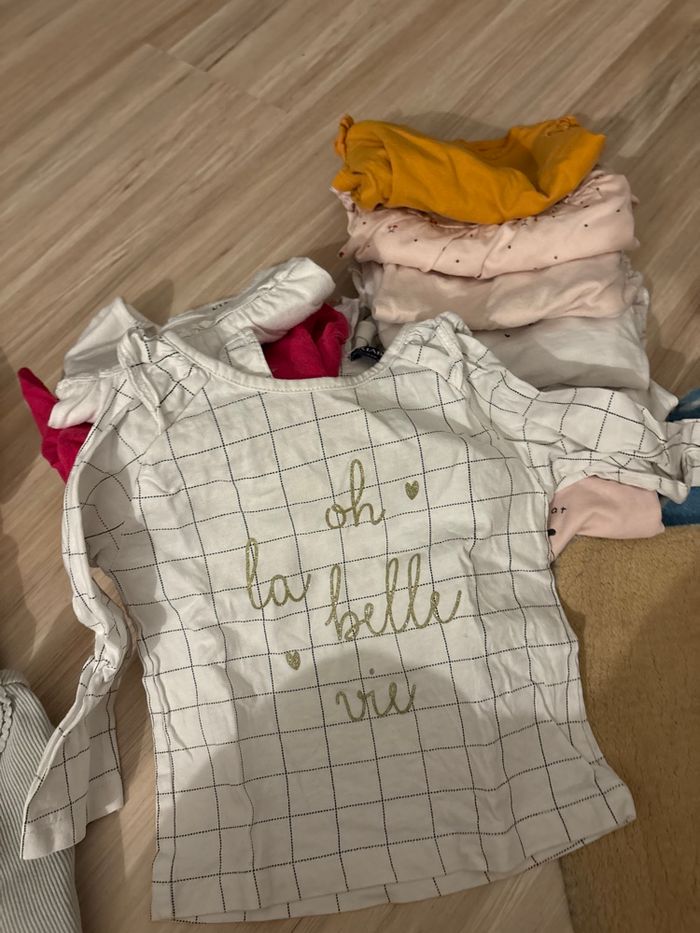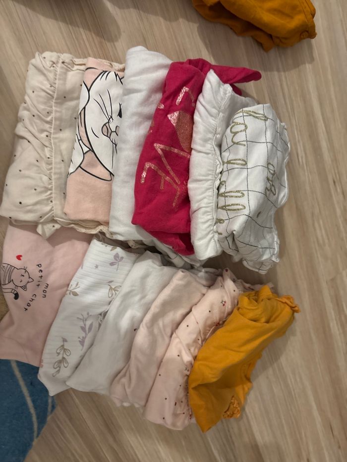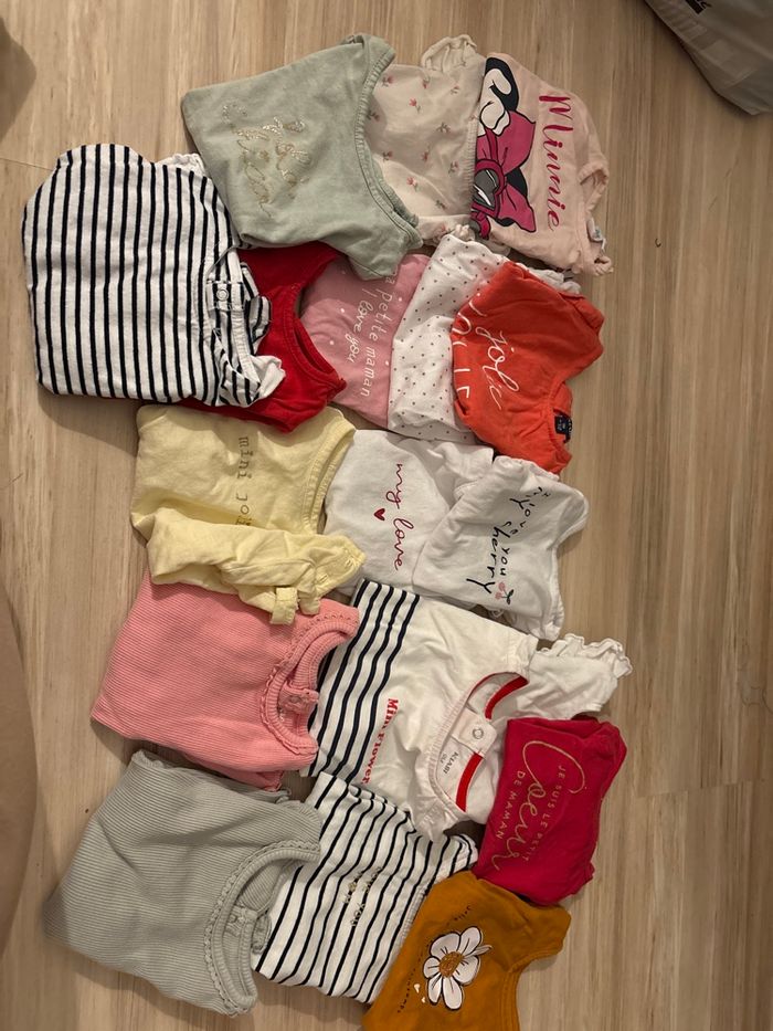 18 teeshirt manches courtes 12 teeshirt manches longues Très bonne état 9 mois Plusieurs marque Disney Kiabi