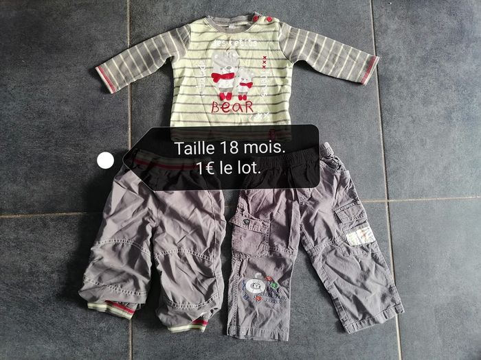 Ensemble garçon. 1 haut et 2 pantalons. Porté quelques fois. Bon état. 18 mois. 1€ le lot.