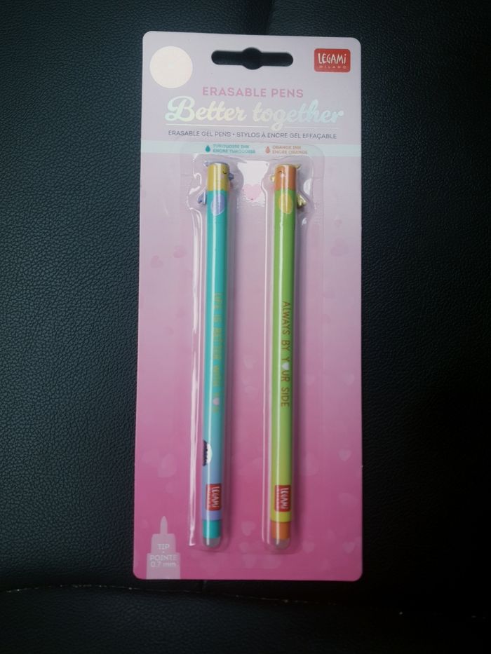 Vends un lot de stylos effaçables Legami St Valentin 2026 Jamais déballés Encre turquoise et orange