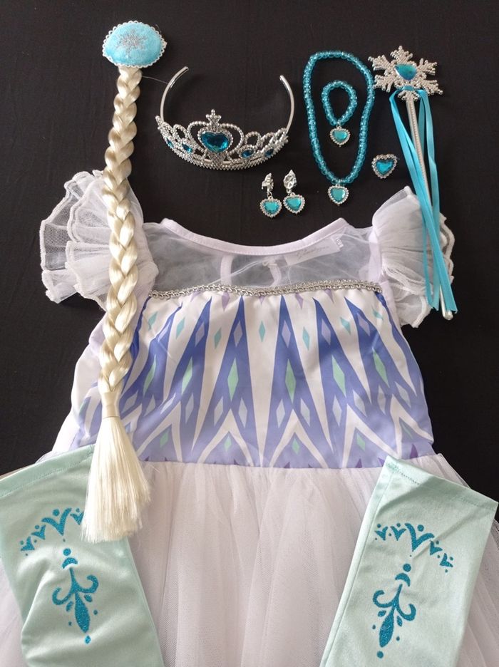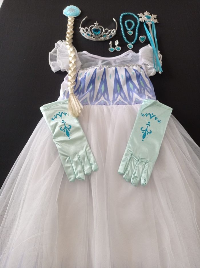 Déguisement robe princesse Elsa et ces accessoires (tresse, gants, baguette, couronne). La robe mesure 85cm de longueur, la taille convient aux petites filles de 5-6ans. Totalement neuve, vendue dans son emballage d’origine. Expédition rapide après votre commande