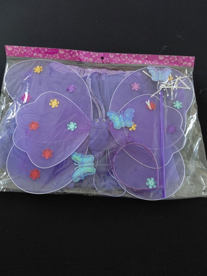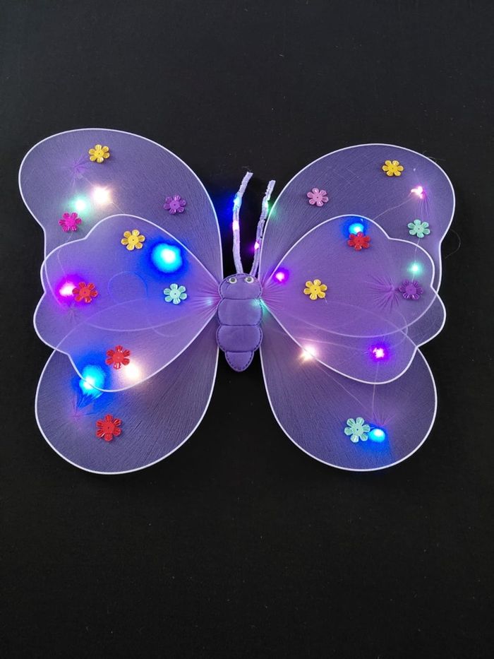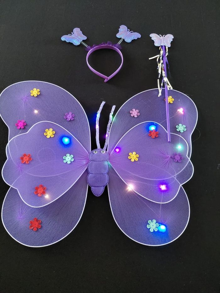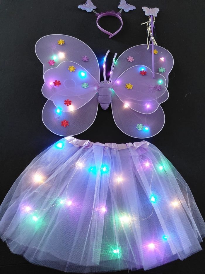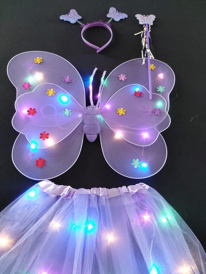 Deguisement papillon violet à LED composé de 4 pièces, une jupe, les ailes de papillon (élastique à enfiler), une baguette et un serre tête. Jupe tutu élastique. Vendu neuf dans son emballage d’origine. Convient aux petites filles de 3-6ans. Expédition rapide après votre commande