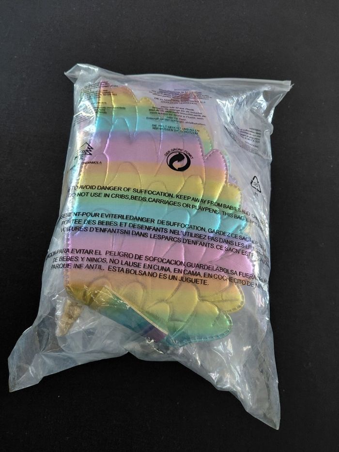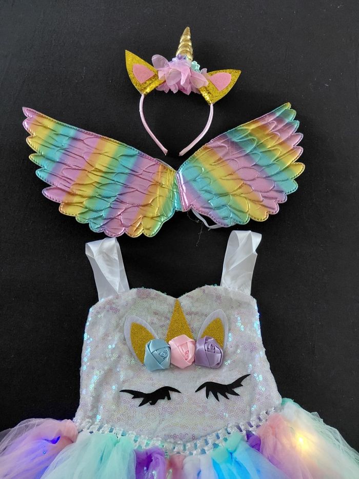 Déguisement licorne et ces accessoires (ailes et serre tête). La robe mesure 50cm de longueur, la taille convient aux petites filles de 3ans. Totalement neuve, vendue dans son emballage d’origine. Expédition rapide après votre commande
