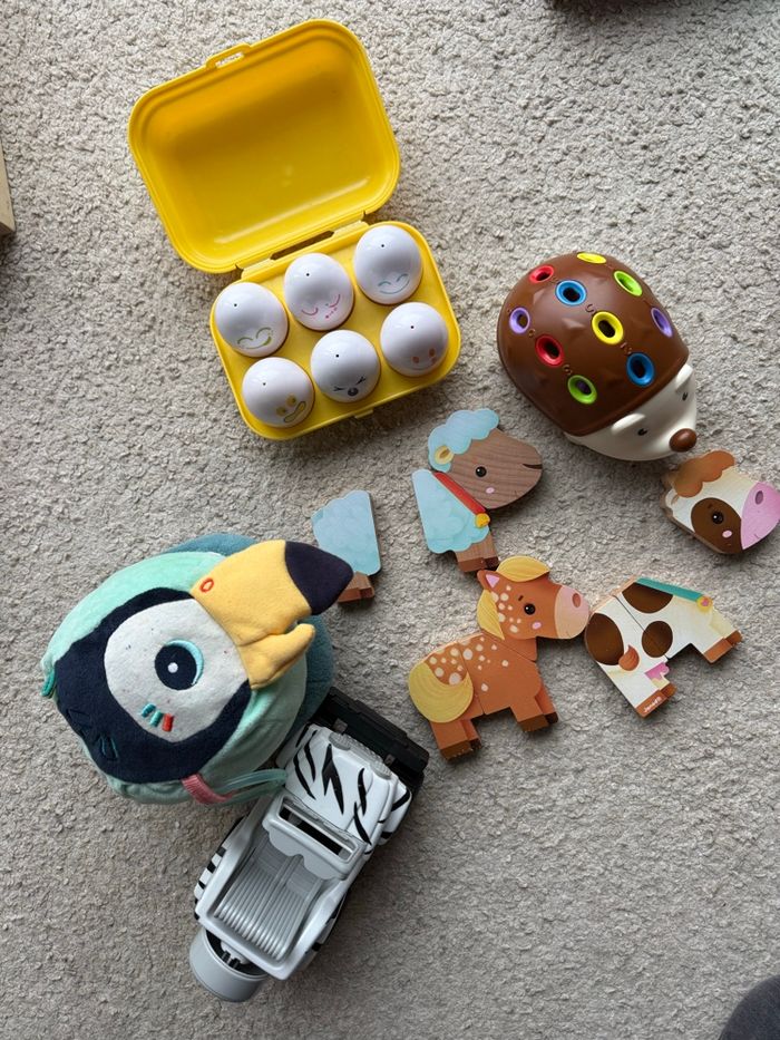 Je vends un lot de jouets d’éveil pour tout-petits, en très bon état : ✔️ Boîte d’œufs éducatifs – jeu d’association ✔️ Hérisson motricité fine avec piquets colorés ✔️ Jouet d’éveil tout doux ✔️ Voiture zèbre ✔️ Puzzle aimanté animaux de la ferme (les morceaux se clipsent entre eux) 🎯 Idéal pour développer motricité fine, logique, imagination et apprentissage des couleurs & formes.