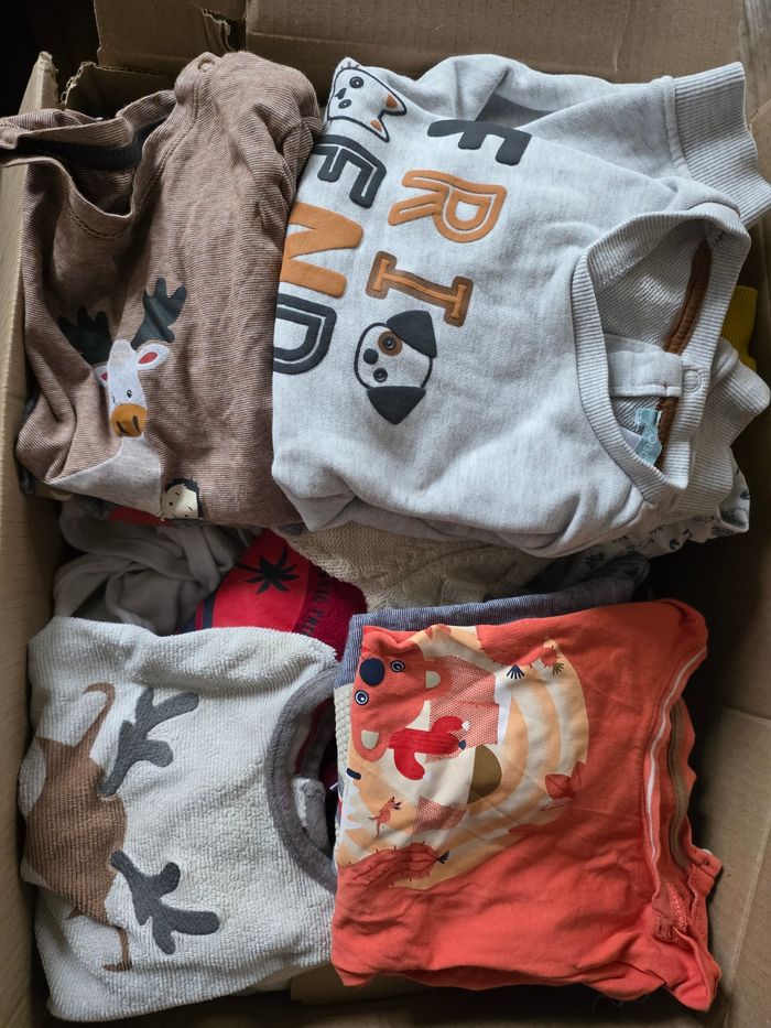 53 pièces au total Seul un tee shirt manche longue présente des traces d'usure le reste est comme neuf Plusieurs marques mais majoritairement okaïdi