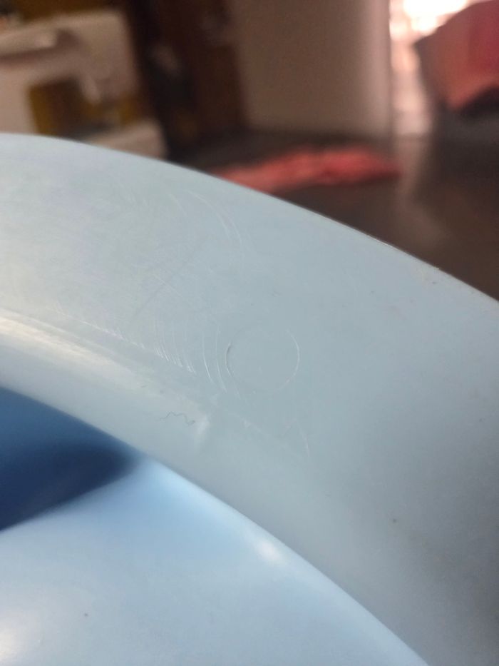 Pas cassé, micro rayure de frotement sous le dessous. très pratique. Marque : thermobaby- france