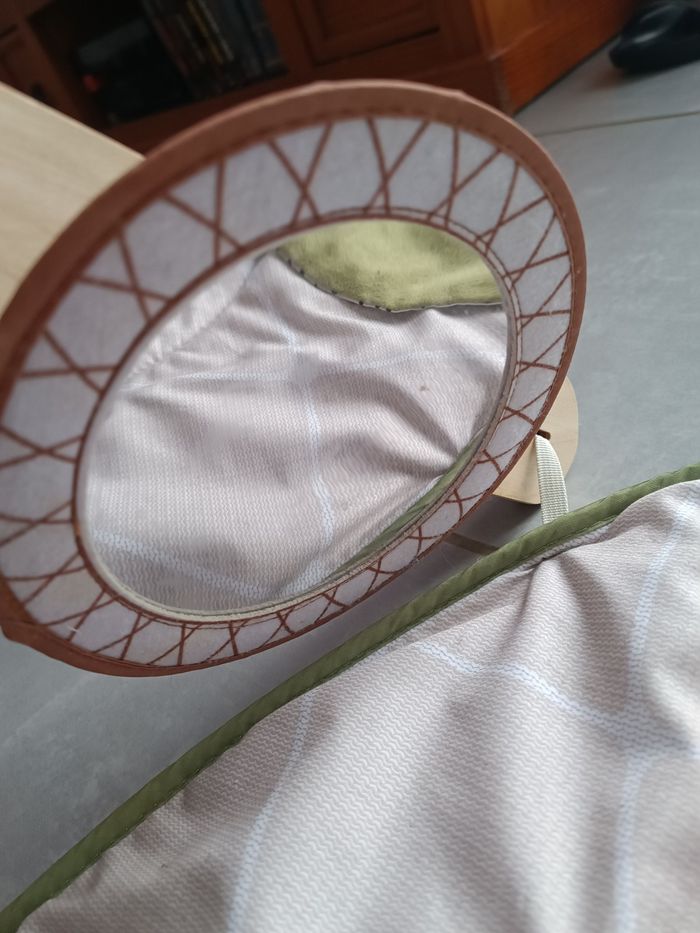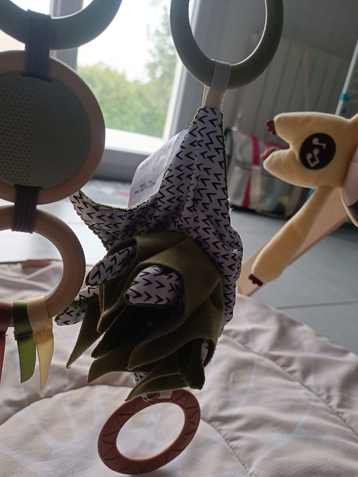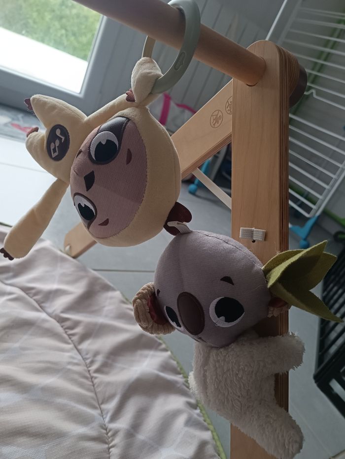 Arche de jeux en bois naturel utilisable seule Tapis très épais et ultra doux Paresseux en peluche électronique et interactif : 4 sons de la nature et mélodies Doudou hochet koala Succulente à feuilles bruissantes cousues dans des tissus aux textures différentes, anneau texturé et balle transparente remplie de billes Feuille hochet géante pour faire du bruit avec les pieds Trio en bois naturel : 3 anneaux de préhension avec hochet et rubans de satin Mobile à feuilles d’eucalyptus en tissu bruissant Feuille cache cache géante en tissu bruissant dissimulant des rubans de satin Miroir attrape rêves Lavable en machine Piles incluses Montage rapide et facile sans outil Dimensions : 46x46x92 cm Valeur neuf : 90 €