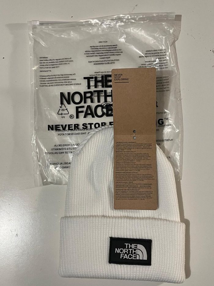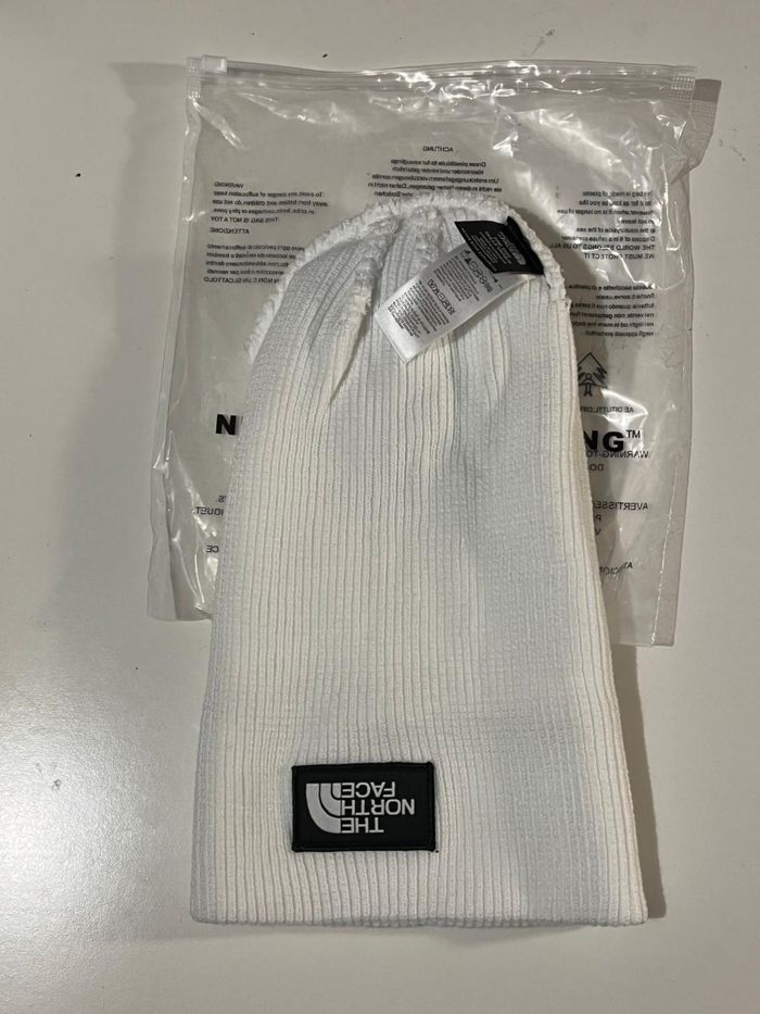 Bonnet en maille côtelée de la marque The North Face, coloris blanc vif, avec logo brodé noir et blanc sur l’avant. Article neuf, jamais porté, encore dans son emballage d’origine avec étiquette et crochet. idéal pour l’hiver ou pour compléter un look streetwear.