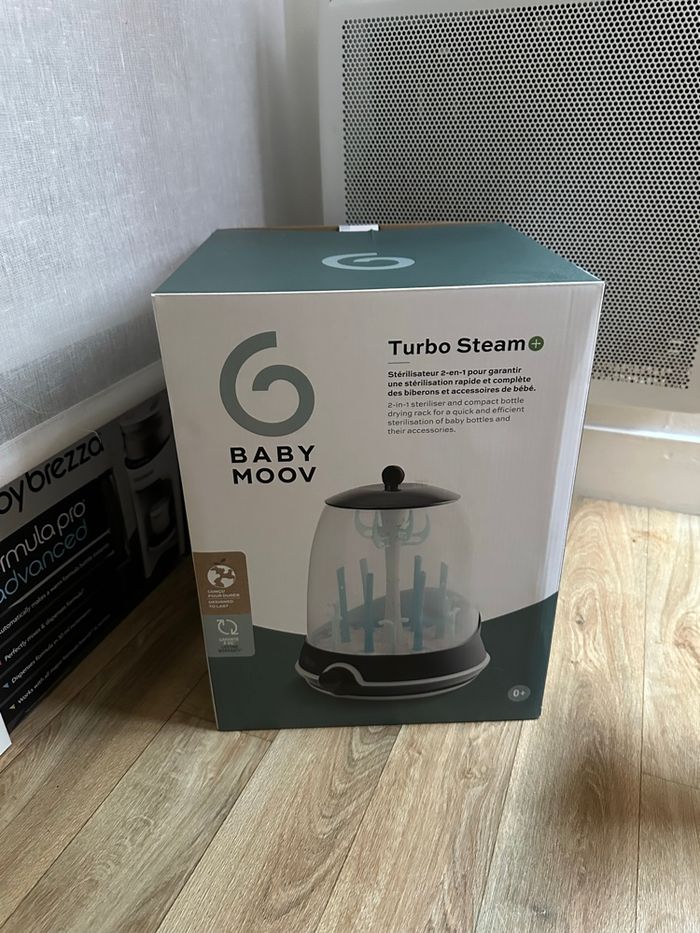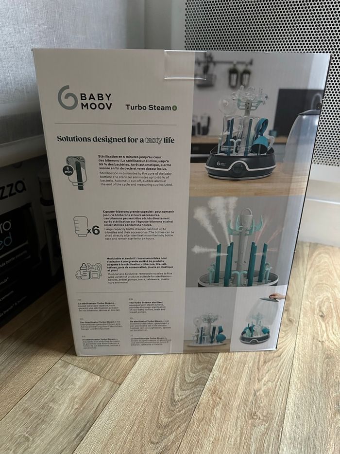 Utiliser quelque fois en égouttoir et utiliser 2 fois en stérilisateur Vendu avec le carton Marque : BABY MOOV TURBO STEAM PLUS