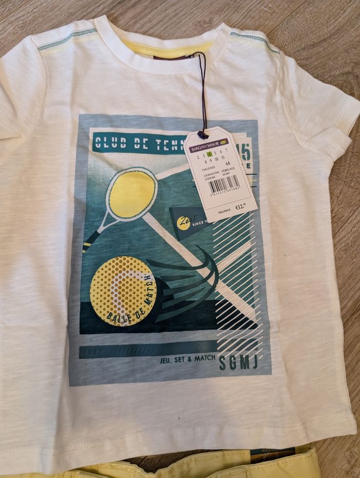 Ensemble club de tennis avec Tee shirt Bermuda (étiquette 3 ans mais taille comme du 4 ans , cf dernière photo en comparaison avec un autre bermuda 4 ans) Casquette taille 2 Paire de chaussettes 25/26 Tout est neuf avec étiquette