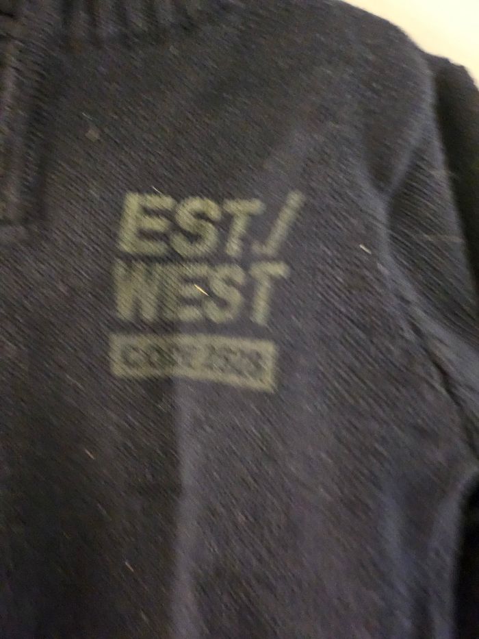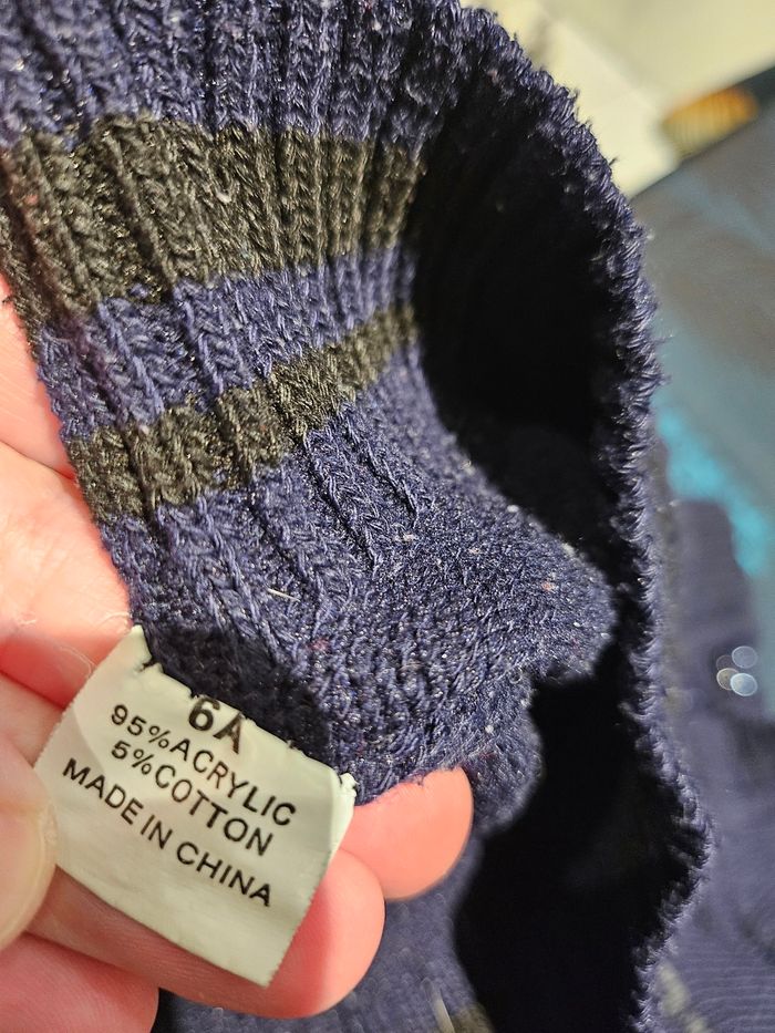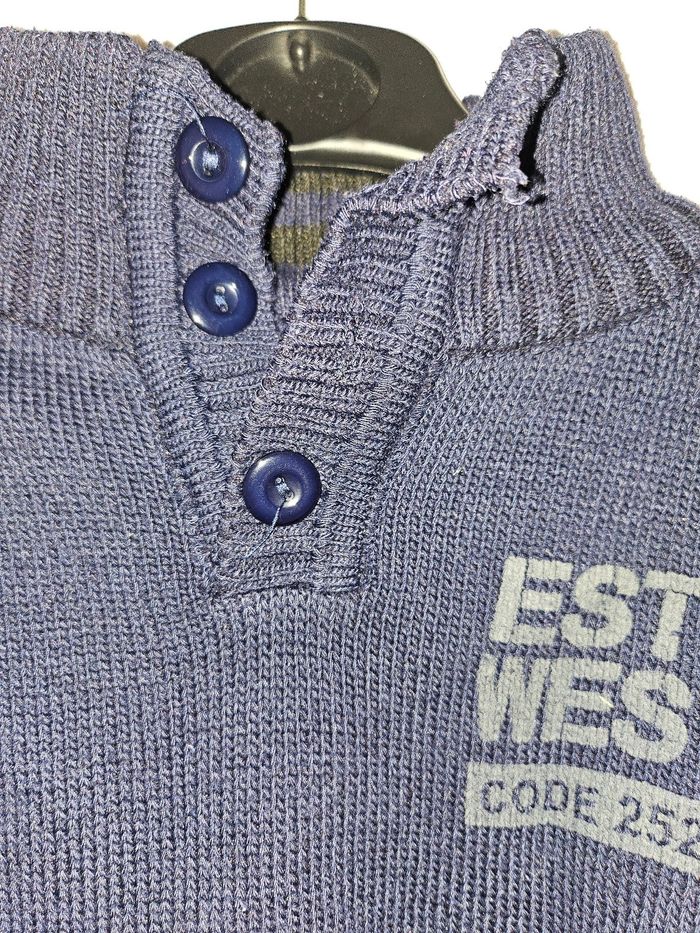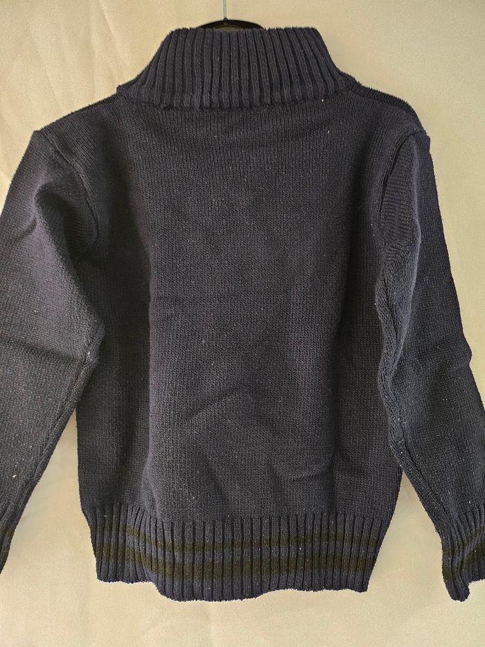 Pull épais manches longues col haut avec 3 boutons. Bleu foncé avec bandes noires. Écriture sur la poitrine. Taille : 6 ans