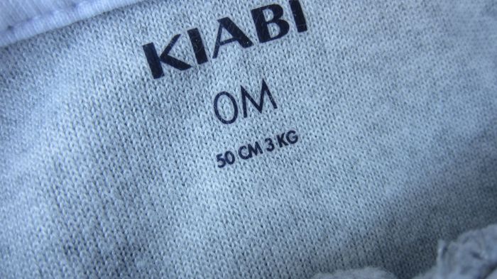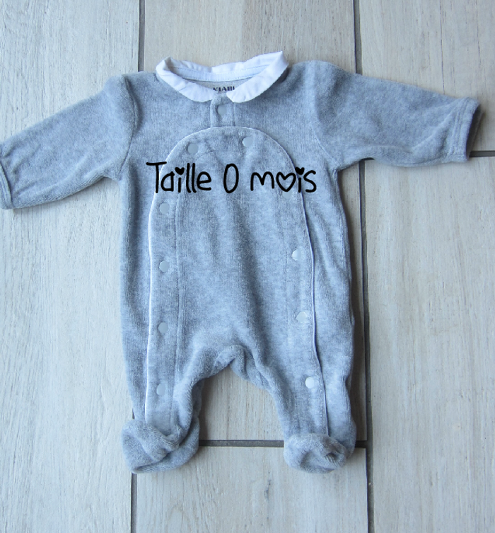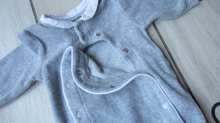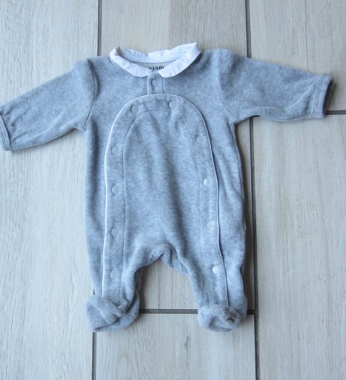 Grenouillere de coloris gris avec petit col blanc. Ouverture sur le devant. Taille naissance ((50 cm). Tres peu portée. Marque Kiabi.