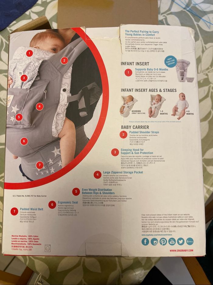 Le Porte-Bébé ERGObaby allie confort, simplicité d’utilisation et sécurité avec ses multiples attaches par clips. Étudié pour les porteurs de toutes tailles et toutes morphologies, il s’adapte à vous. Dans ce bundle of joy, vous trouverez un insert cocon pour porter bébé dès la naissance, ainsi qu’un coussin pour surélever bébé jusqu’à qu’il soit assez grand pour être porté sans accessoire. * Lavable à la machine au cycle délicat. * 2 Pochettes de rangement à l'avant * Tissu anti-UV pour couvrir la tête de bébé et également lui maintenir s’il s’est endormi * 3 positions de portage possibles en fonction de l’âge de votre bébé J’ai personnellement adoré ce porte-bébé qui est super pratique, confortable et esthétique. Mon fils et moi avons passé de longues heures à se câliner avec. Et avoir les mains libres, ça n’a pas de prix 😄 Il est en très bon état. Je l’ai lavé. Je vous le fournis dans sa boîte d’origine avec les instructions pour plus de facilité. #portebebe #portebébéphysiologique #ergobaby #portebebeergobaby #portebebeevolutif #