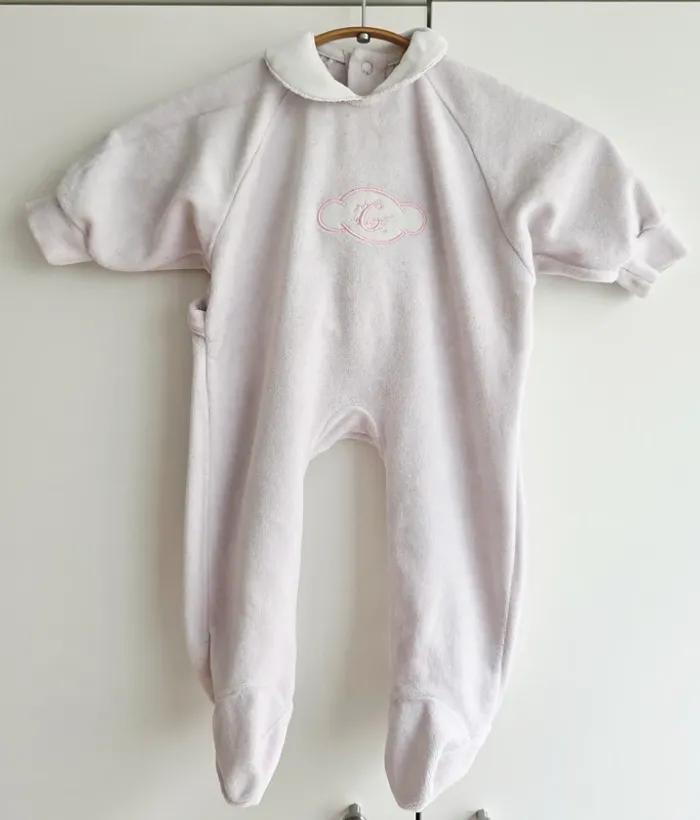 Dors bien de marque Ligne Toup'ti, taille 6 mois, 81% coton, 19% polyester, toucher velours. Couleur rose clair, motif.