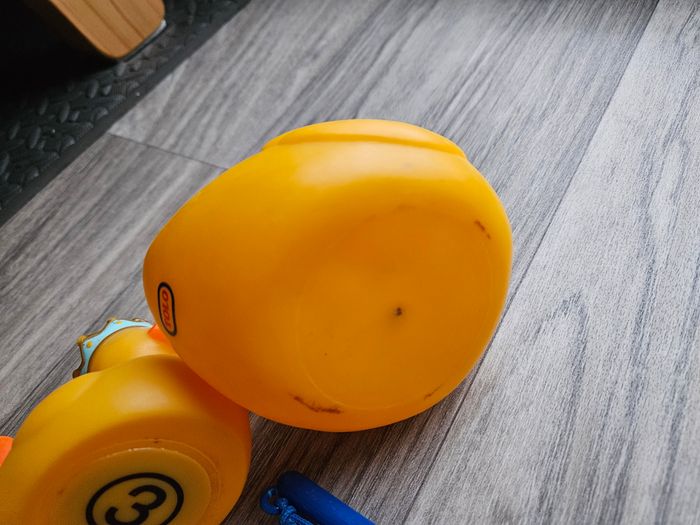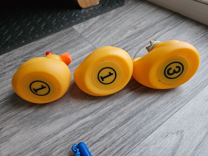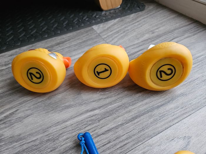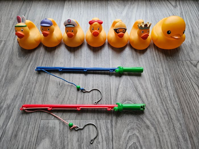 La pêche aux canards de Djeco, une activité ludique pour les enfants dès 2 ans. Il y a 2 cannes à pêches, 6 canards rigolos, tous reconnaissables grâce à leur accessoire de déguisement, et j'offre une maman canard avec. Les canards sont numérotés, ce qui permet d’inventer d’autres règles du jeu. Les 6 canards sont lestés et insubmersibles, ils ne se retournent jamais une fois déposés sur l’eau. Idéal pour jouer seul ou à plusieurs, en intérieur ou en plein air. Pour jouer dans le bain, sur une table ou dans un seau plein d'eau comme à la fête foraine. Les cannes à pêche sont courtes, donc facilement maniables par de petites mains. Dimensions des canards : 6,6 x 8,3 x 5,9 cm Le bout d'une des cannes à pêche est cassée, cela ne gêne pas l'utilisation, il est possible de mettre du ruban adhésif haute résistance, mais je n'en ai pas mis pour que vous voyez bien son état. Et, il y a quelques petites traces d'utilisation sous certains canards. Tous cela est visible sur les photos.