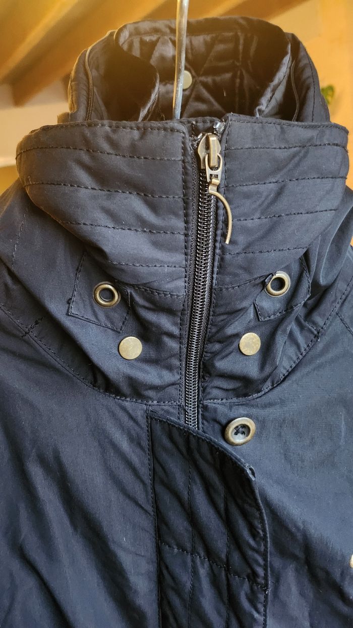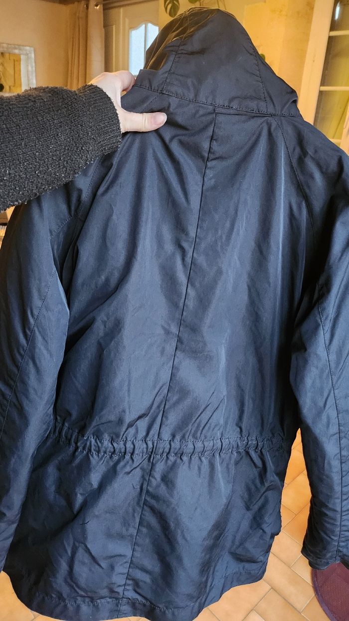 Doublure matelassée amovible (légères bouloches a l'intérieur) Lien de serrage a la taille 4 poches + 1 dans la doublure matelassée Capuche ultra couvrante, manque la partie moumoute qui se met autour mais n'altère en rien son utilité! Se ferme avec double zip et/ou boutons. 1 zip cassée cf photo mais ferme très bien quand meme
