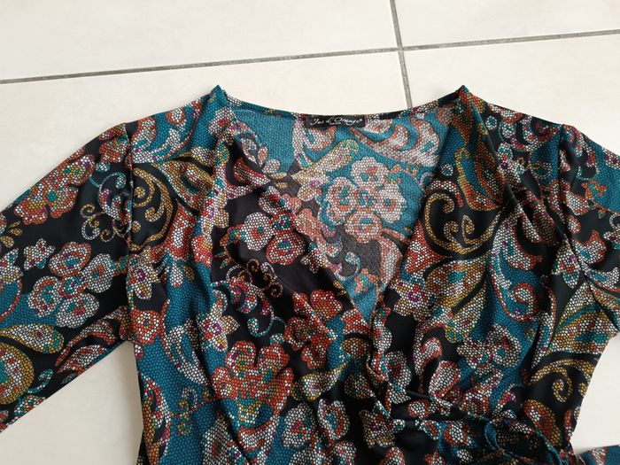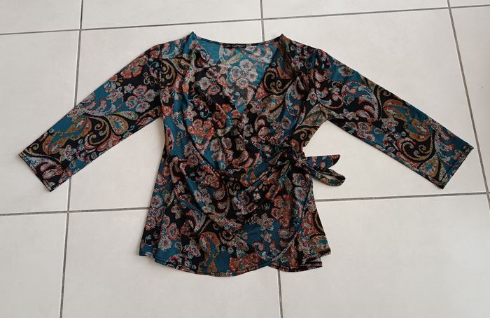 Bonjour, Vends un haut cache coeur (attaché, ne se défait pas). Jus d'orange. Taille 40 Très bon état.