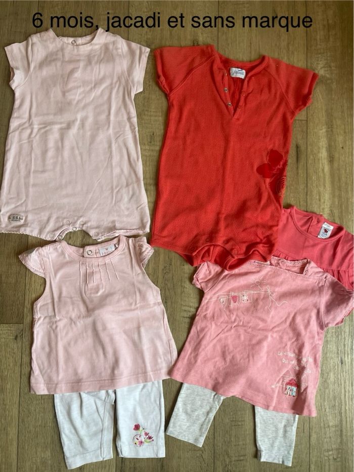 Bonjour, Je vends un lot de vêtements d’été, en taille six mois, avec deux petits points Deux Combies, dont une de la marque Jacadi Trois T-shirts manches courtes et deux legging Trois beaux manches courtes Une combi débardeur