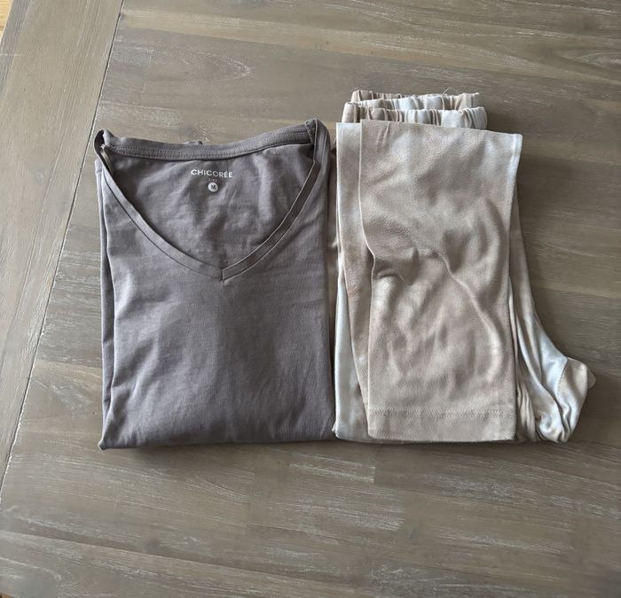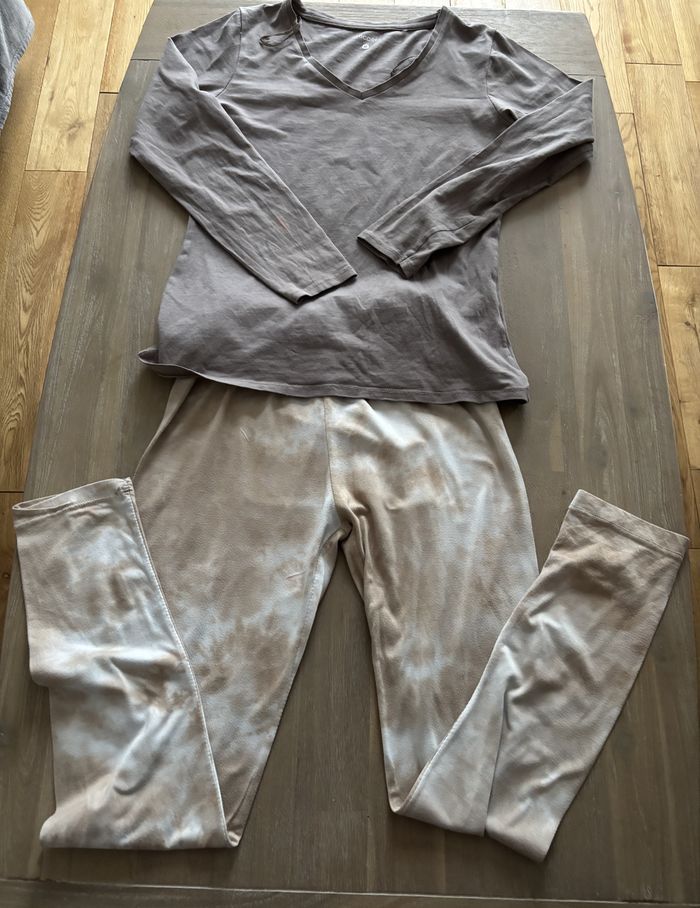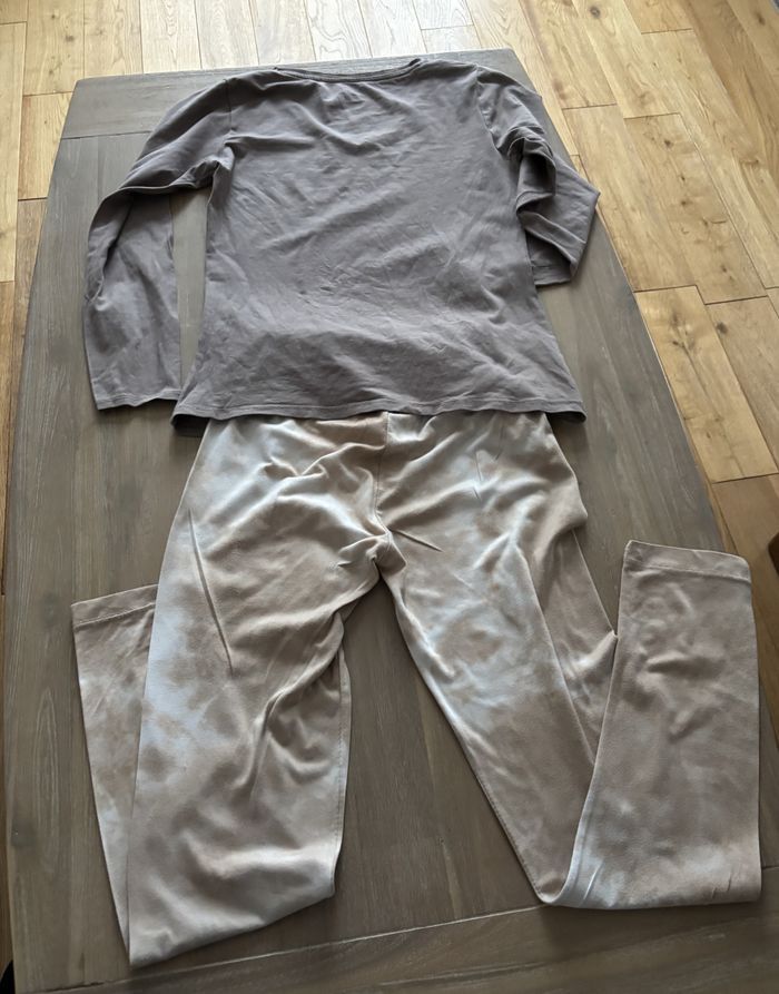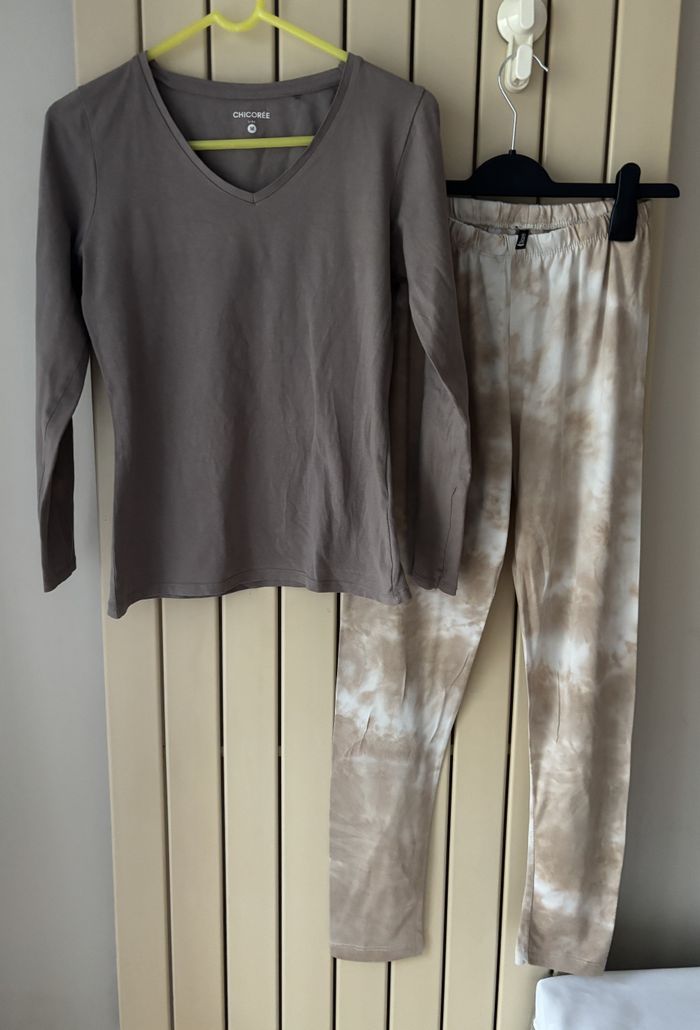 Pyjama deux pièces , manches longues Chicorée. Coloris taupe , beige. Taille M. Peu porté, très bon état, mais tache au dos d'une manche. Voir photo 8. N'hésitez pas à faire des lots😉.