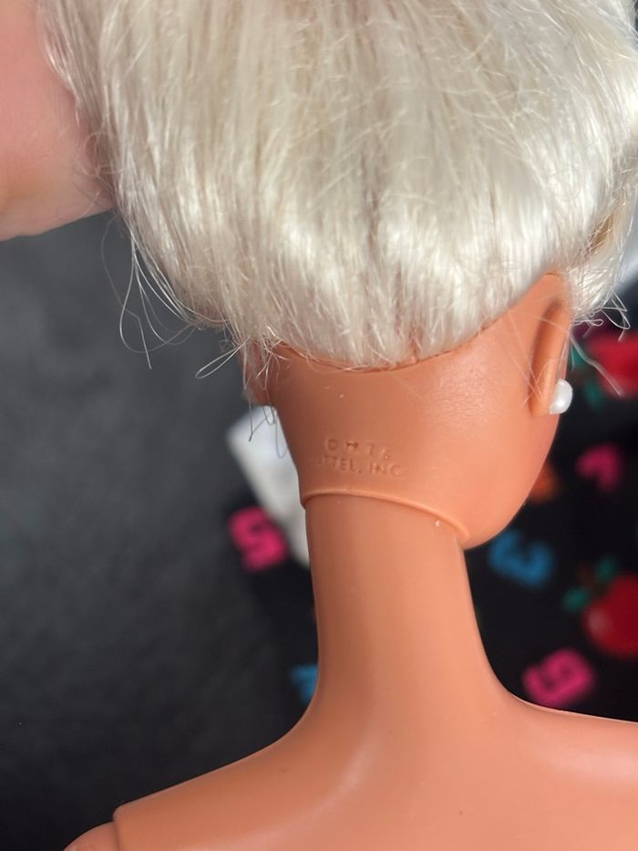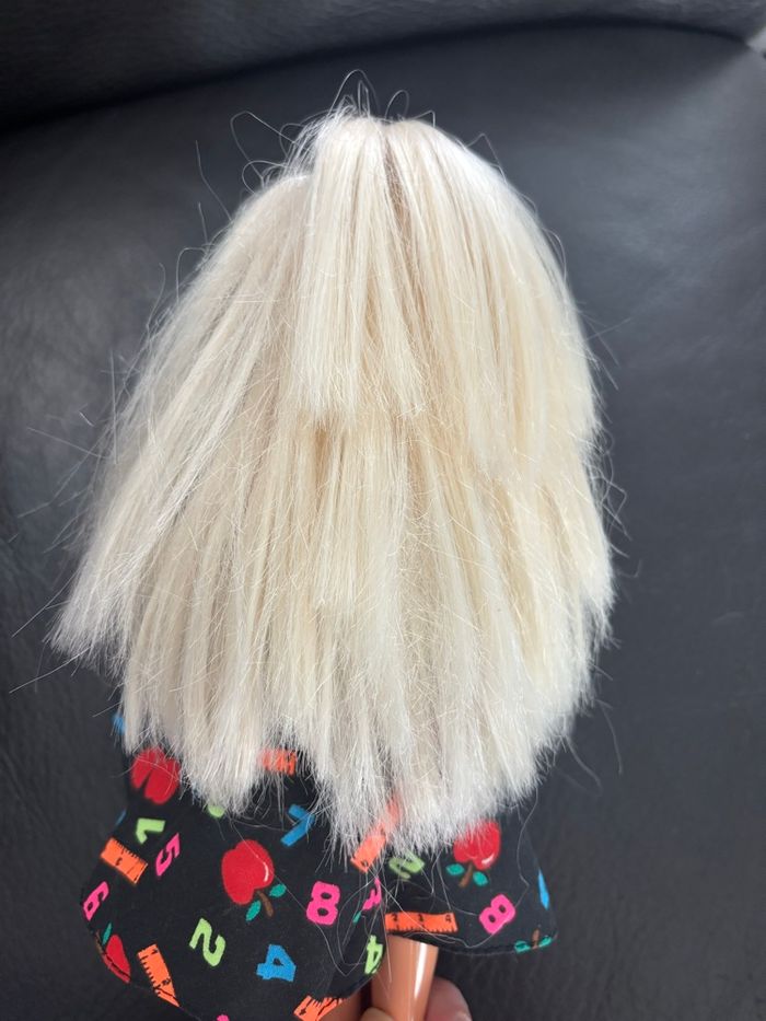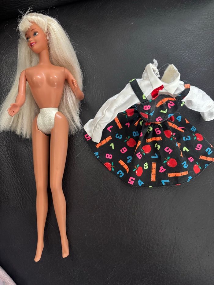 poupée Barbie Maîtresse d'école (Teacher) originale des années 90. Elle porte sa tenue emblématique sur le thème de l'école. Bon état général pour son âge. La main présente un petit orifice (prévu à l'origine pour tenir un accessoire). Idéal pour compléter une collection de Barbies vintage ou pour offrir un jouet de qualité au look rétro. Vendu en l'état, sans boîte ni chaussures (voir photos pour le détail de l'état).