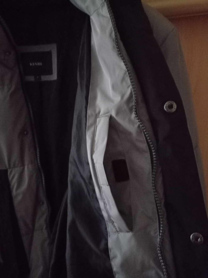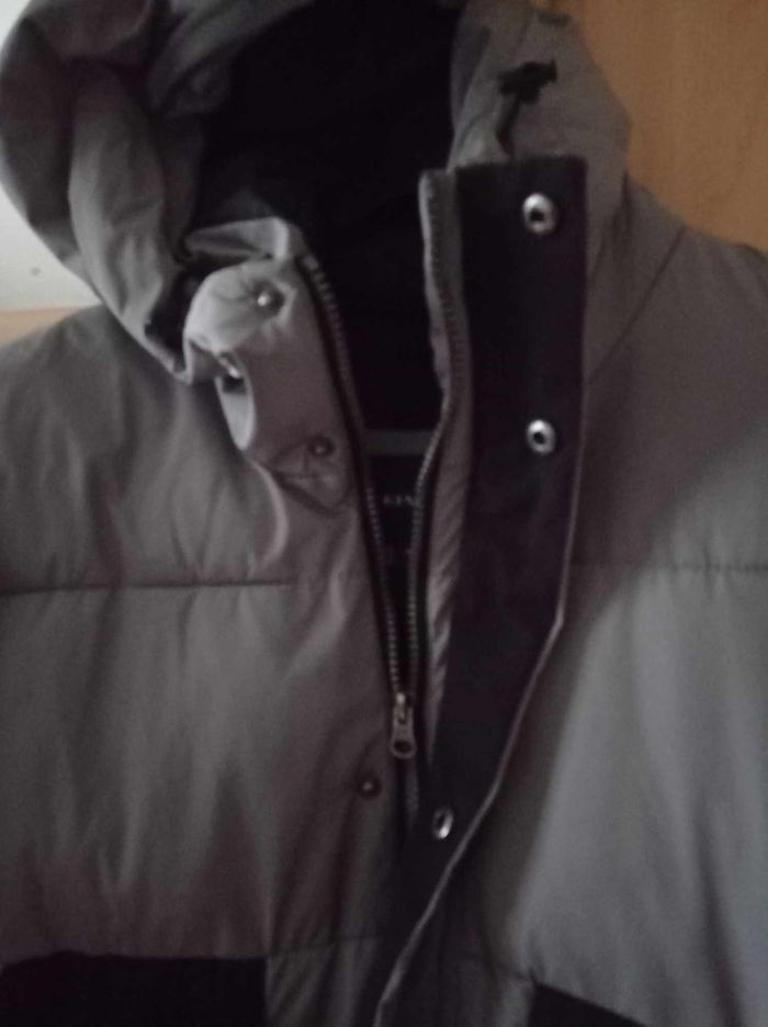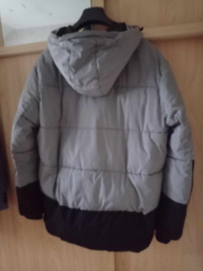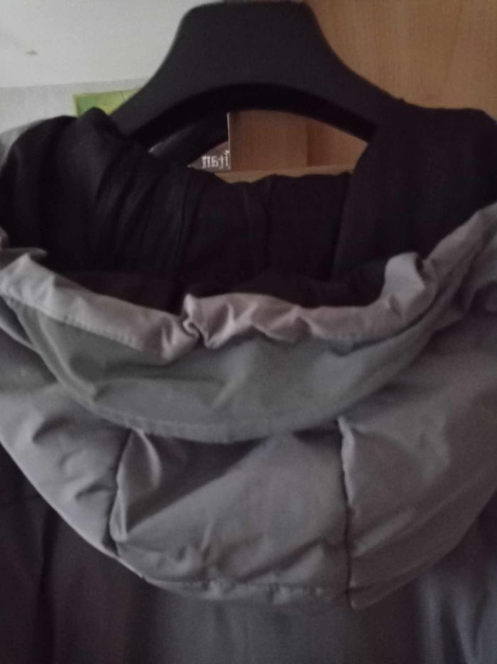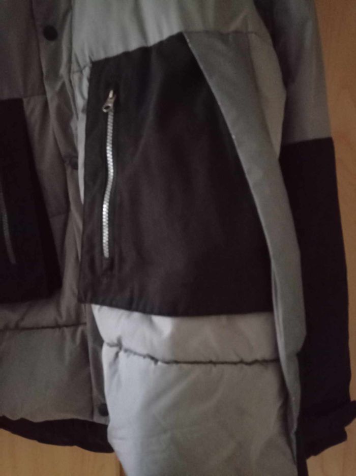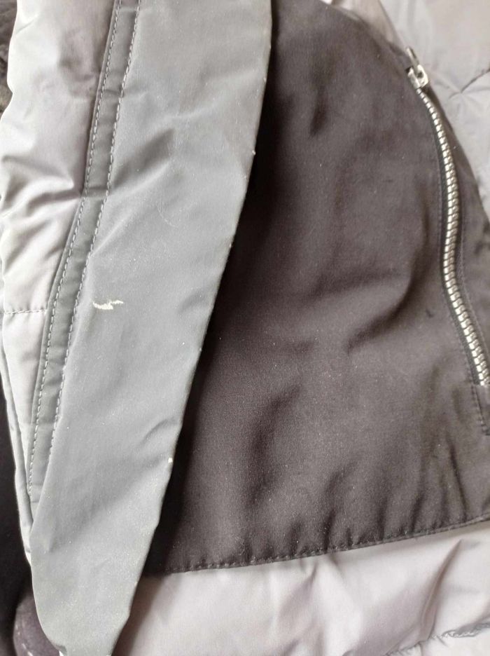 Doudoune gris/noir, bien chaude avec plusieurs poches dont 1 intérieure (photo 4), légère, fermée par zip + patte à pressions, dos plus long que devant. Taille M (ou 18 ans). Lavable en machine, en polyester enduit et coton. ## Petites usures sur les bandes réfléchissantes sur le côté des poches (voir les 2 dernières photos) ## - Largeur entre épaules : 48 cm, largeur entre aisselles : 61 et hauteur au dos : 78 cm -