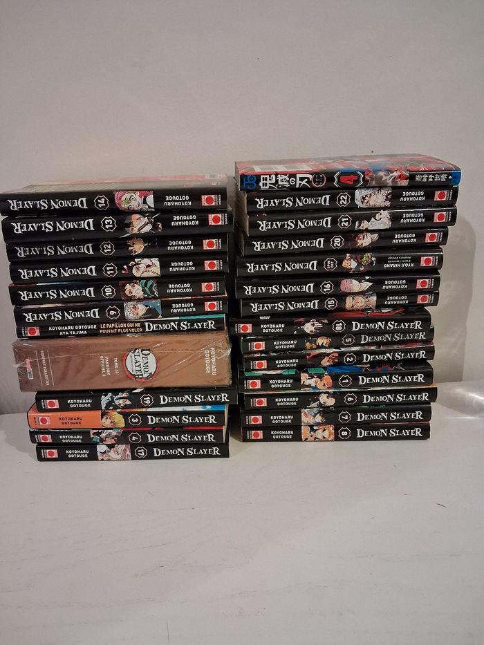 Collection complète Demon Slayer avec le dernier tome en coffret collector. Le lot comprend également le tome 4 en japonais venu directement du Japon.