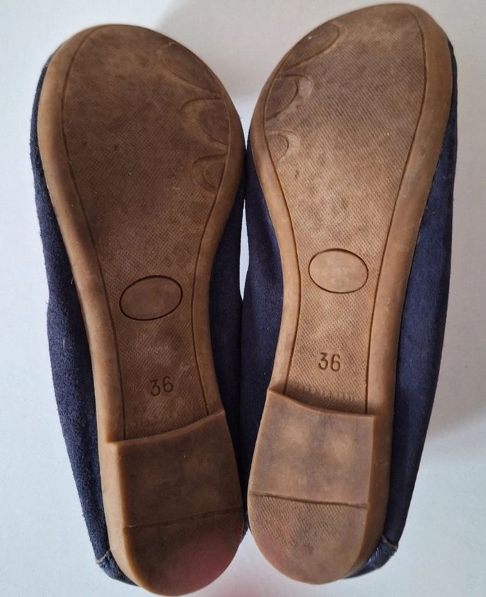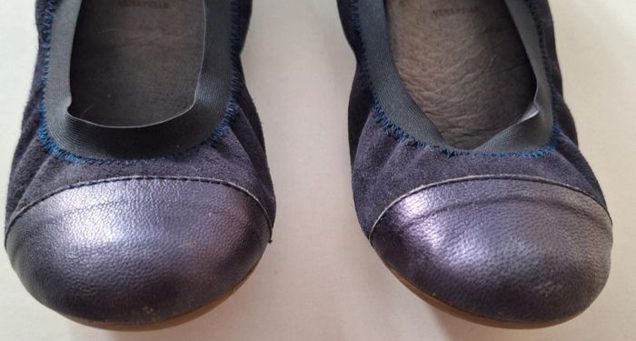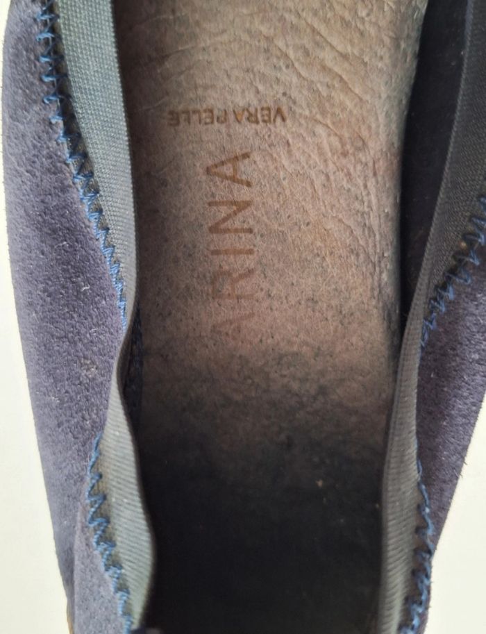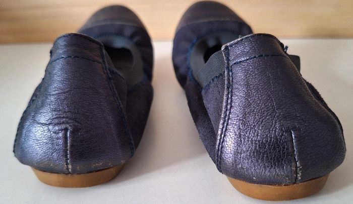 Tour du pied avec un élastique pour un bon maintien du pied. Devant et talons de la chaussure de couleur marine légèrement brillante.