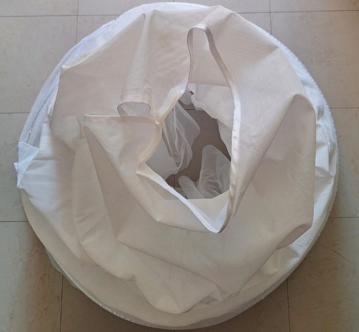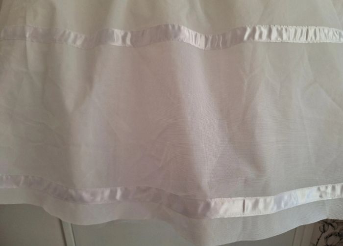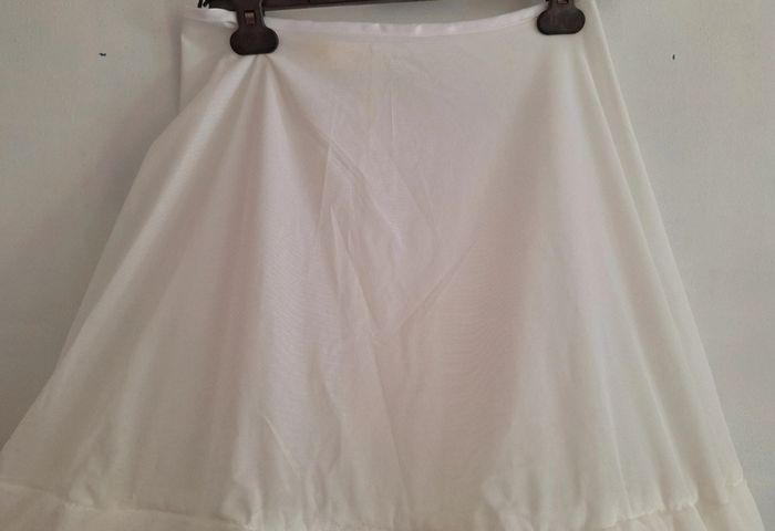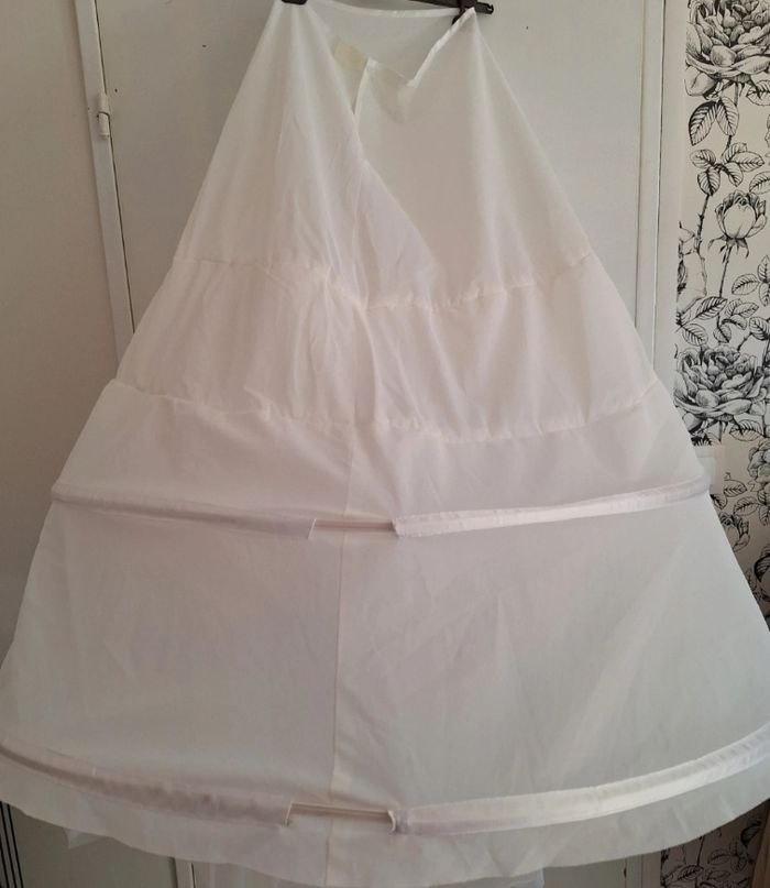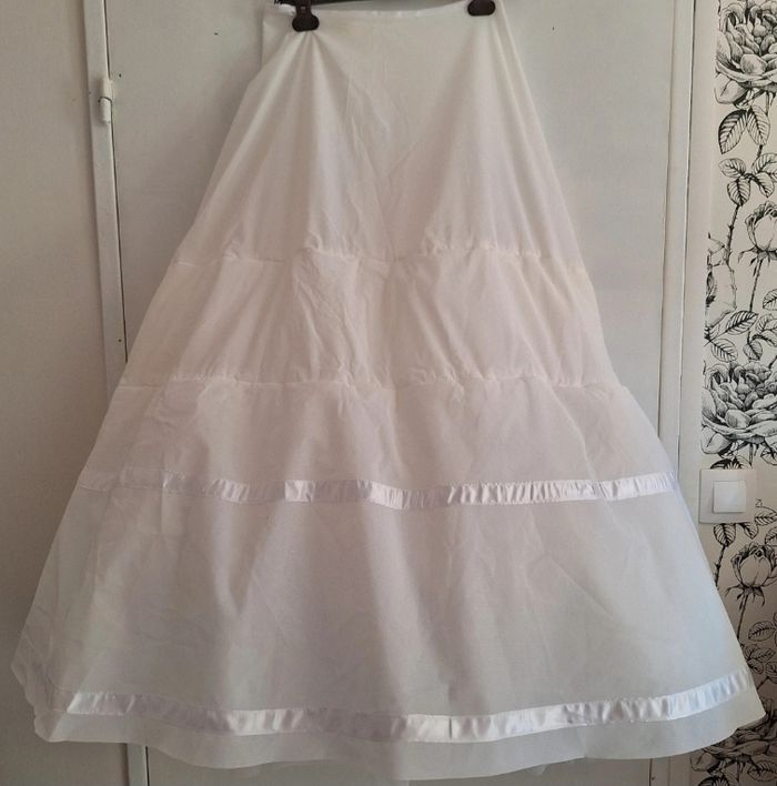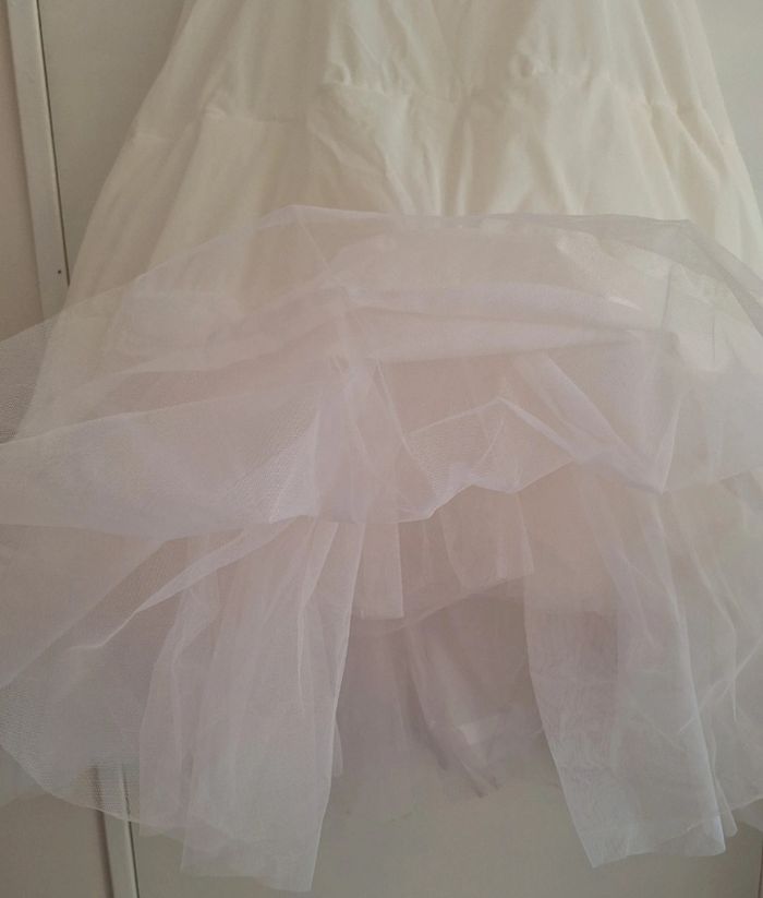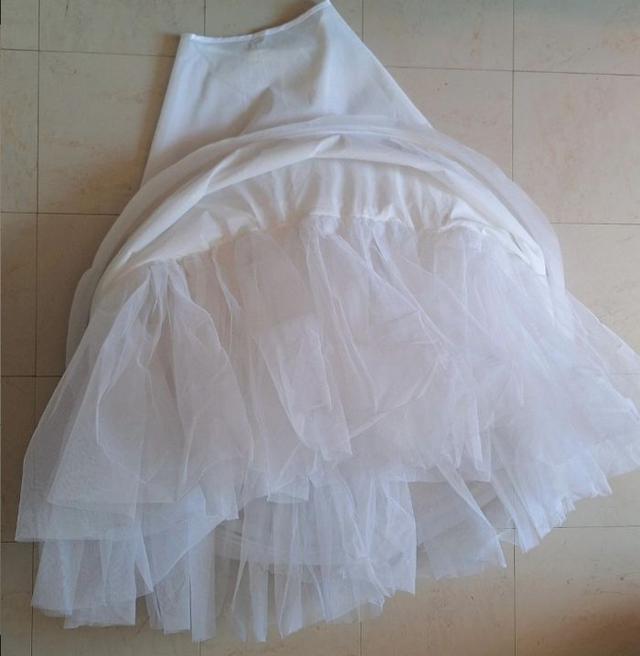 Longueur totale 95 cm. Fermeture à scratch au dos qui s'adapte ainsi à toute morphologie. Jupon avec double épaisseur de tulle. Deux arceaux sont à enfiler dans des encoches. Acheté à Complicité mais il n'y a pas d'étiquette dessus. En bon état avec quelques traces qui ne peuvent se voir puisque c'est à placer sous la robe de mariée. Sachet d'origine.