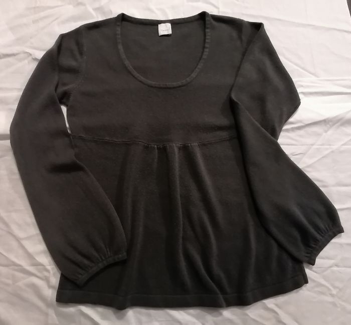 Pull format tunique, grande et belle encolure, marque Camaïeu, Taille 2/3, Couleur gris foncé, Manches longues foncées au poignet, Couture sous poitrine avec quelques fronces qui donnent une légère amplitude au pull. Très agréable à porter