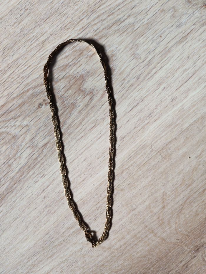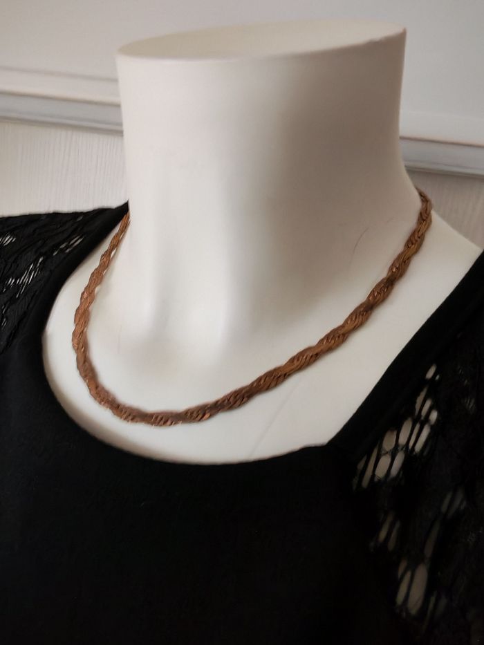 Chaîne en métal dorée plate maille type serpent, en très bon état général, un peu ternie. Longueur 43 cm, épaisseur 5mm, poids 14g.