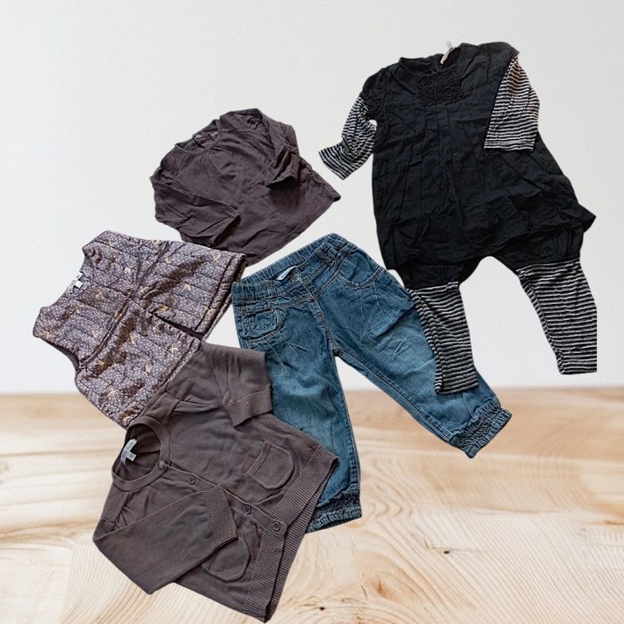 1 robe salopette 1 veste matelassé sans manche 1 gilet 1 tee-shirt manche longue 1 jeans #troc38420_18moisfille