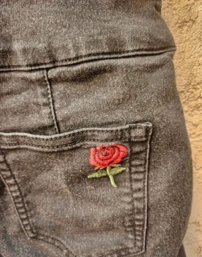 Combishort noir en jean avec zip sur le devant perle et rose brodés sur la poche arrière Tally weijl Taille 38 Très bon état Aucun défaut Prix négociable Remise en main propre possible