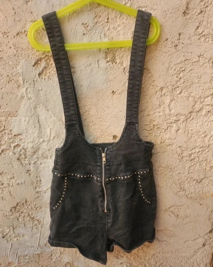 Combishort noir en jean avec zip sur le devant perle et rose brodés sur la poche arrière - photo numéro 1