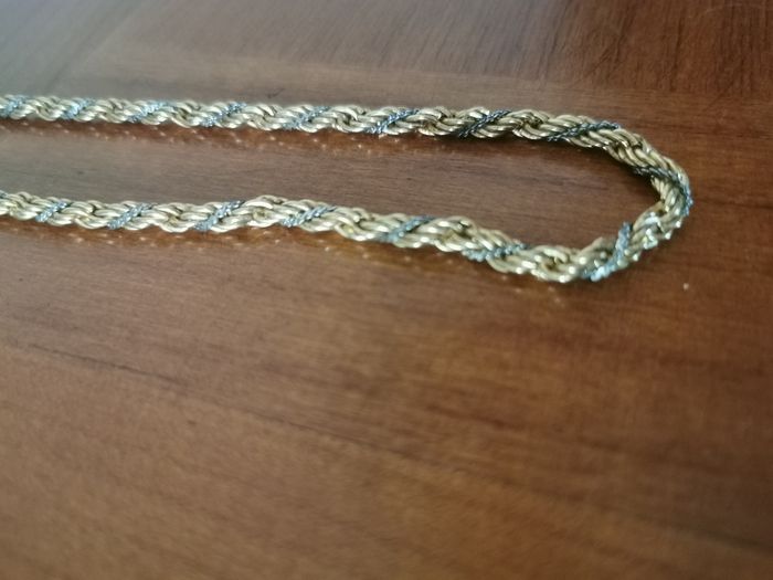 Chaîne torsadée qui entremele les deux couleurs dorée et argentée, Yves Rocher vintage, en trés bon état. Dimensions : Longueur totale : 40 cm Epaisseur : 3 mm Poids : 19g