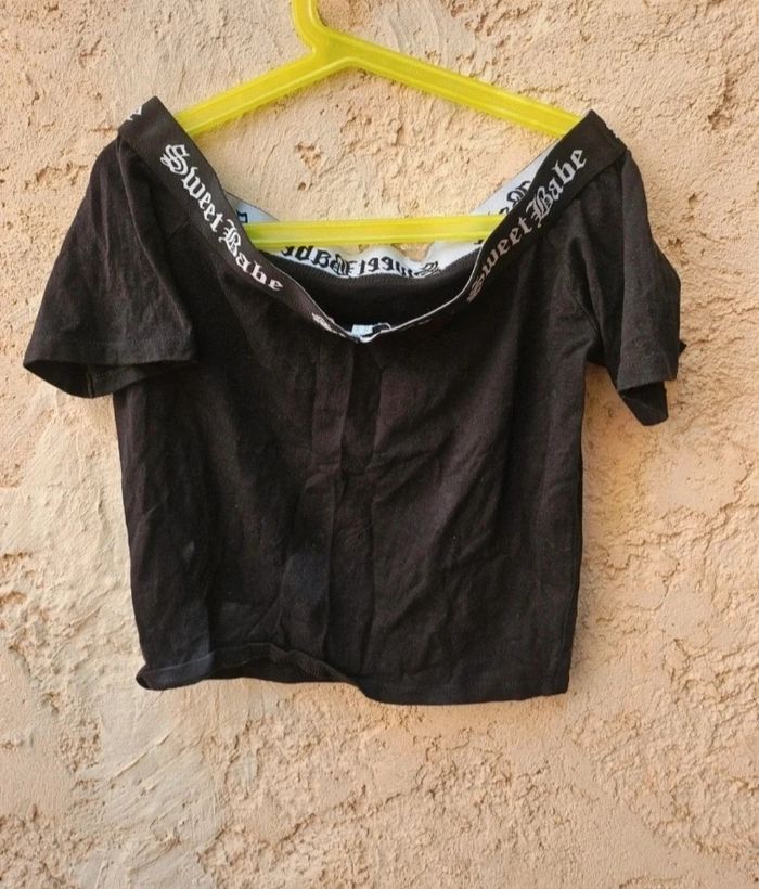 Top épaule dénudé noir avec écriture en gothique Jennyfer Taille M Très bon état Aucun défaut Prix négociable Remise en mains propres possible