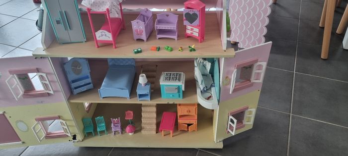 Maison pour poupée en bois et ses accessoires. État général satisfaisant Nombreux accessoires N'hésitez pas à demander pour plus de détails.