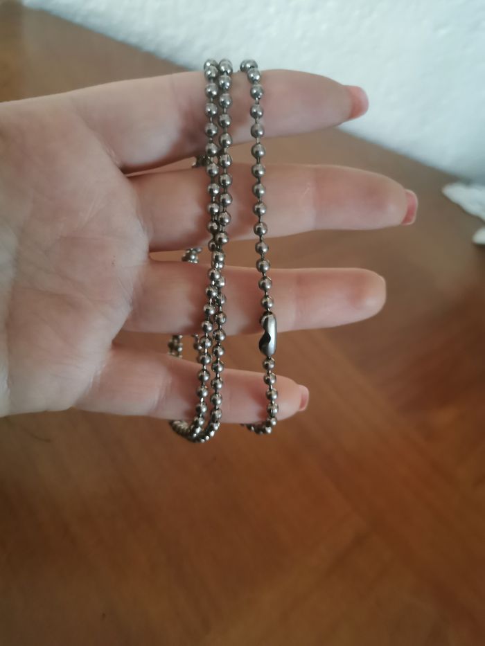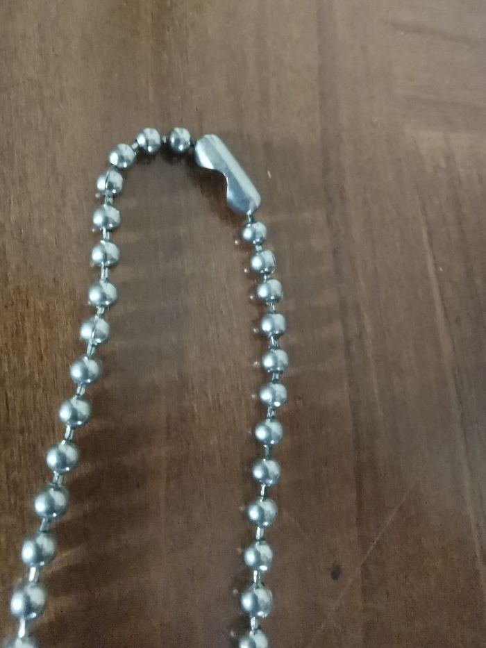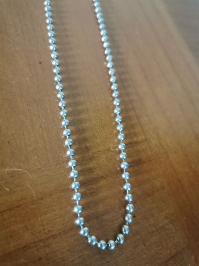Sautoir chaîne argentée mailles boules, en très bon état, sans fermoir, à enfiler. Dimesions : Longueur suspendu : 35 cm Tour : 70 cm Epaisseur : 3mm Poids : 18g