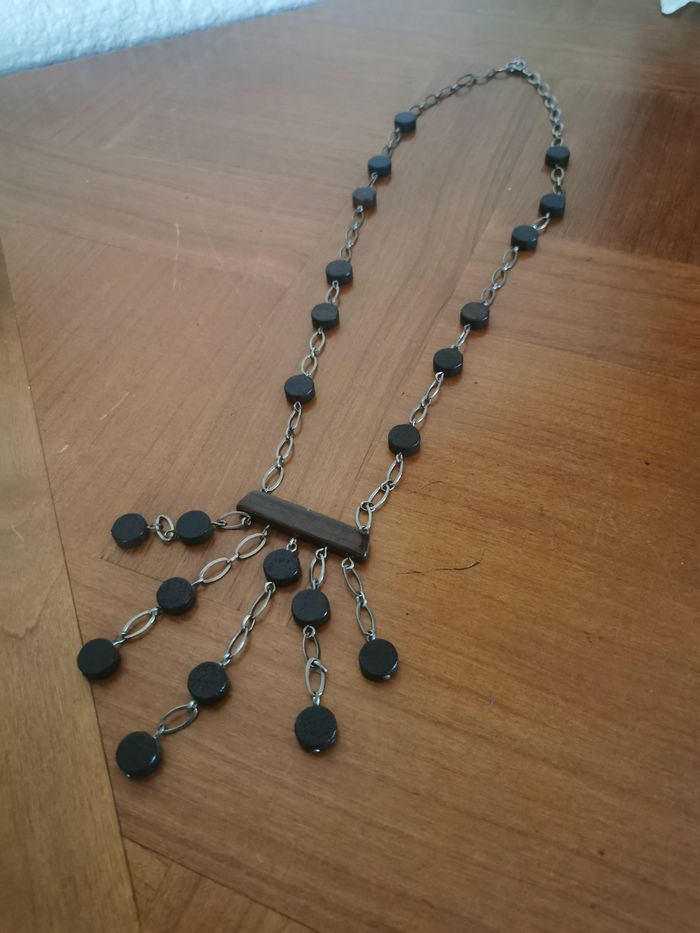 Sautoir en bois marron foncé et acier argenté, en bon état général, mais il lui manque une père en bois. Très légér. Dimensions : Longueur (tour) : 60 cm Longueur pendentif : 7,5 cm Diamètre pèrles : 8 mm Poids : 17g