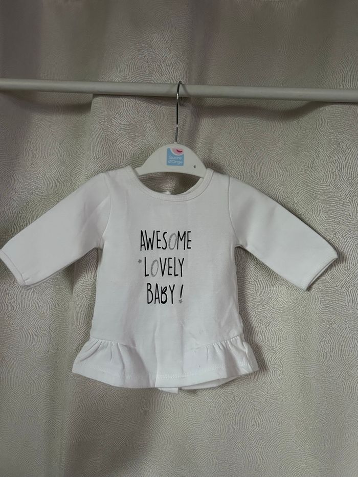 Pull tunique molletonné blanc S’ouvre entièrement milieu dos Taille naissance 100% coton Tex Écritures noires et paillettes argentées pour les O